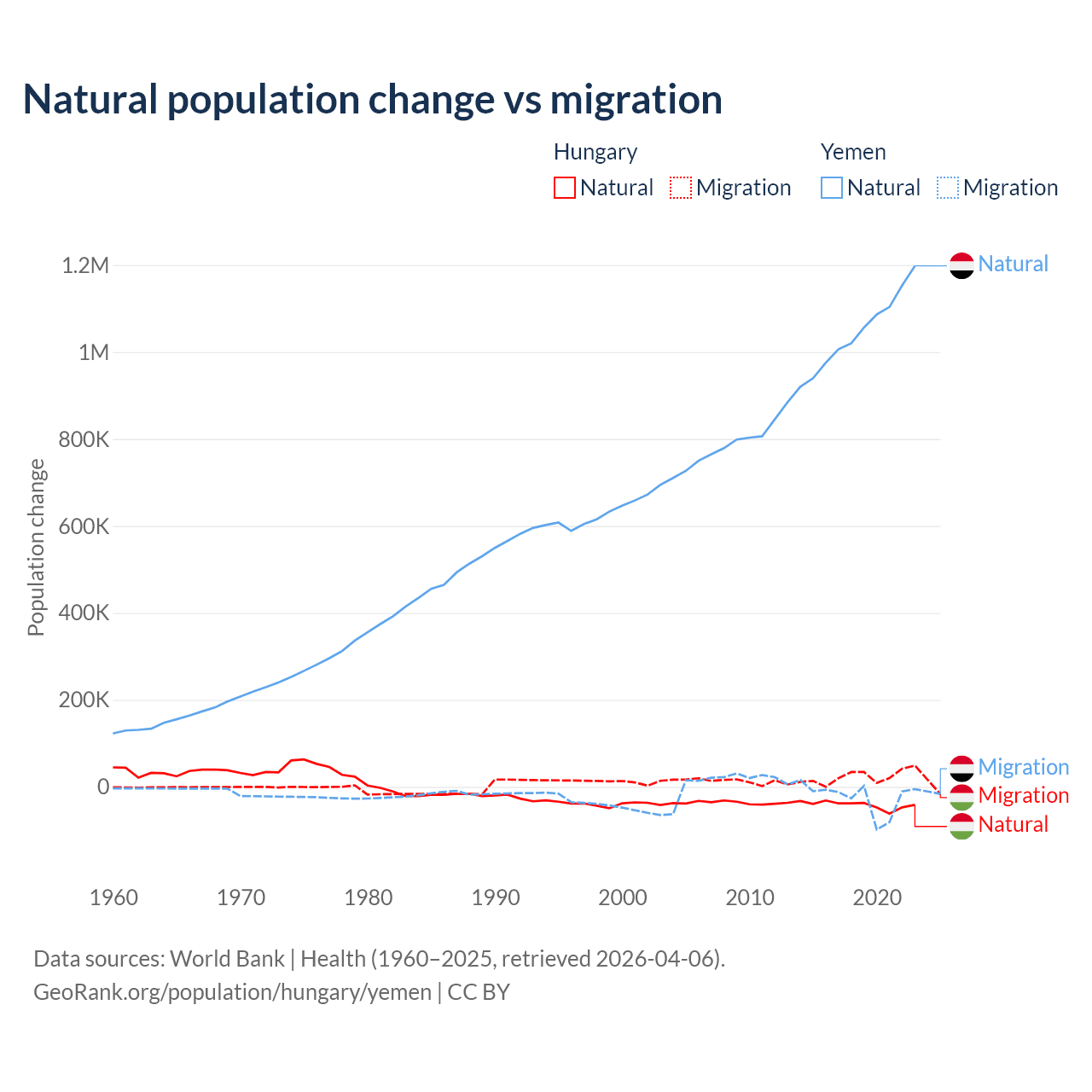 Over the last 10 years, 63.7% of the population change in Hungary is from natural causes (a loss of 412,838 people) and 36.3% is from migration (a gain of 234,837 people). In Yemen 97.8% is from natural causes (a gain of 10,460,813 people) and 2.17% is from migration (a loss of 231,814 people).