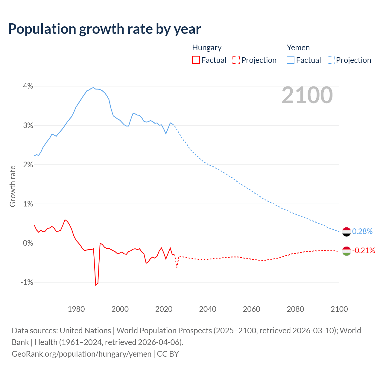 - For the last 10 years, Hungary has had an average growth rate of -0.29% per year vs +3% in Yemen.