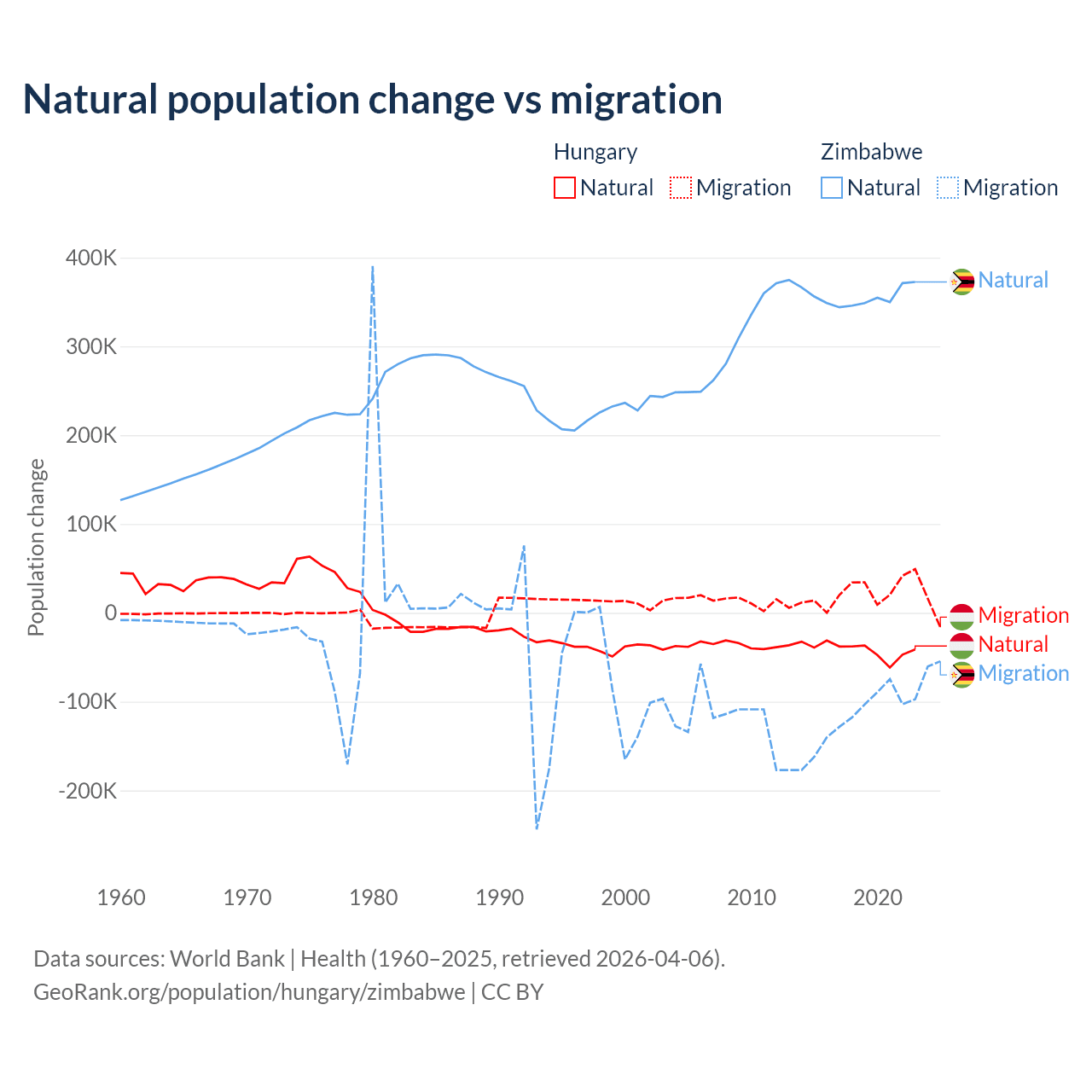 Over the last 10 years, 63.7% of the population change in Hungary is from natural causes (a loss of 412,838 people) and 36.3% is from migration (a gain of 234,837 people). In Zimbabwe 74.9% is from natural causes (a gain of 3,558,487 people) and 25.1% is from migration (a loss of 1,192,807 people).