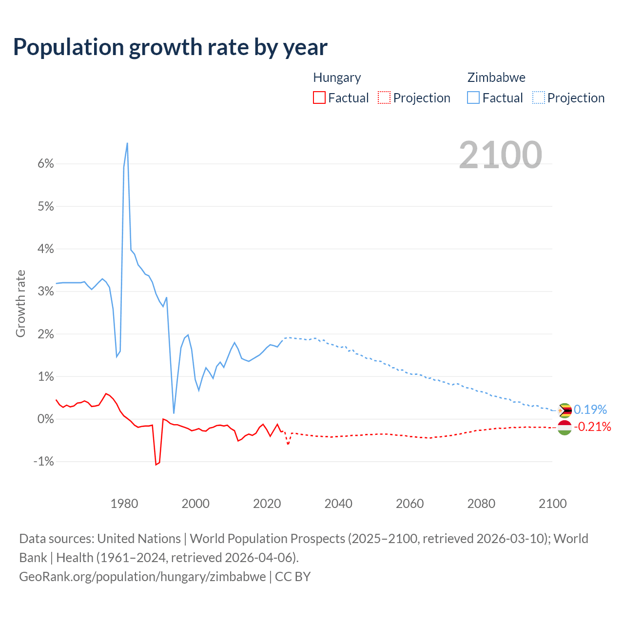 - For the last 10 years, Hungary has had an average growth rate of -0.29% per year vs +1.57% in Zimbabwe.