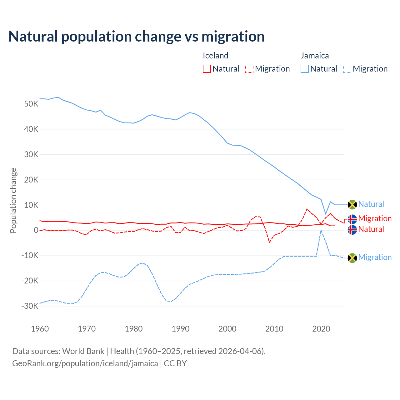 Over the last 10 years, 30.7% of the population change in Iceland is from natural causes (a gain of 20,128 people) and 69.3% is from migration (a gain of 45,356 people). In Jamaica 61.3% is from natural causes (a gain of 137,465 people) and 38.7% is from migration (a loss of 86,681 people).