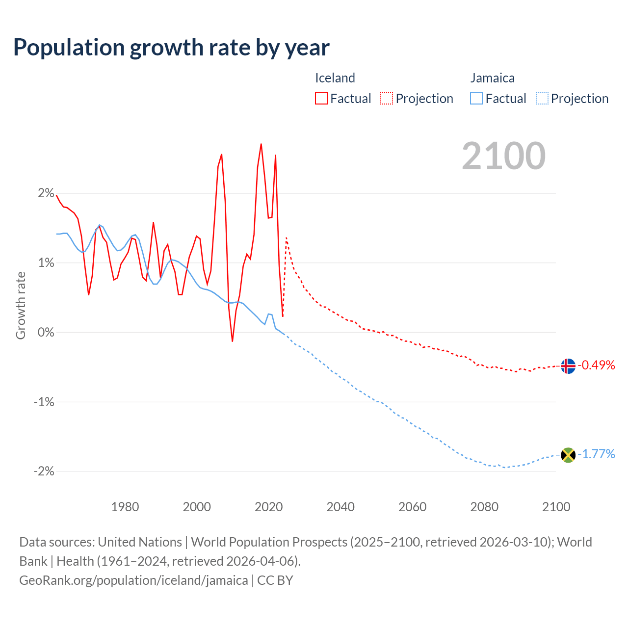 - For the last 10 years, Iceland has had an average growth rate of +1.63% per year vs +0.18% in Jamaica.