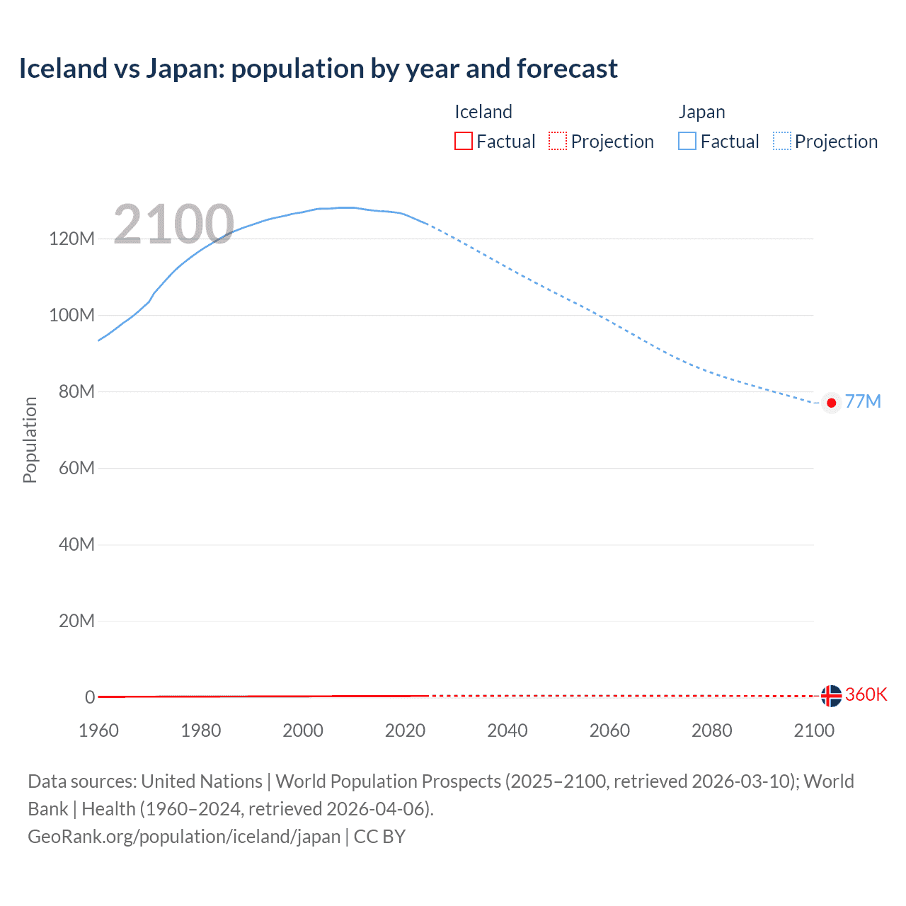 Iceland vs Japan: population by year and forecast