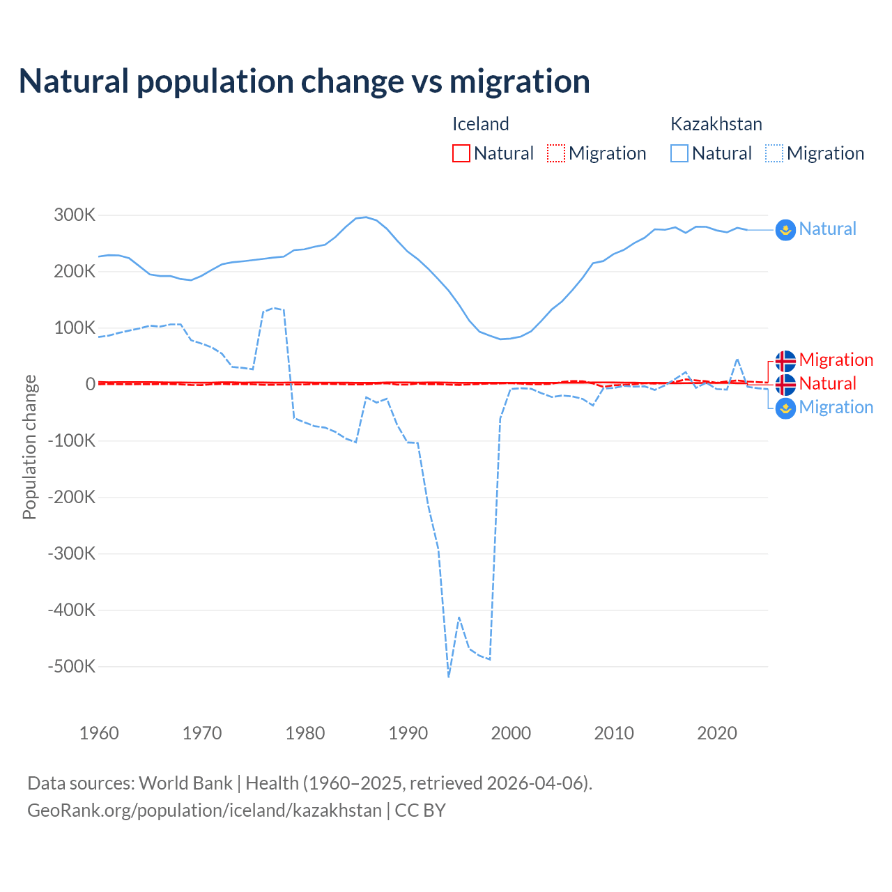 Over the last 10 years, 30.7% of the population change in Iceland is from natural causes (a gain of 20,128 people) and 69.3% is from migration (a gain of 45,356 people). In Kazakhstan 98.7% is from natural causes (a gain of 2,743,094 people) and 1.33% is from migration (a gain of 36,908 people).