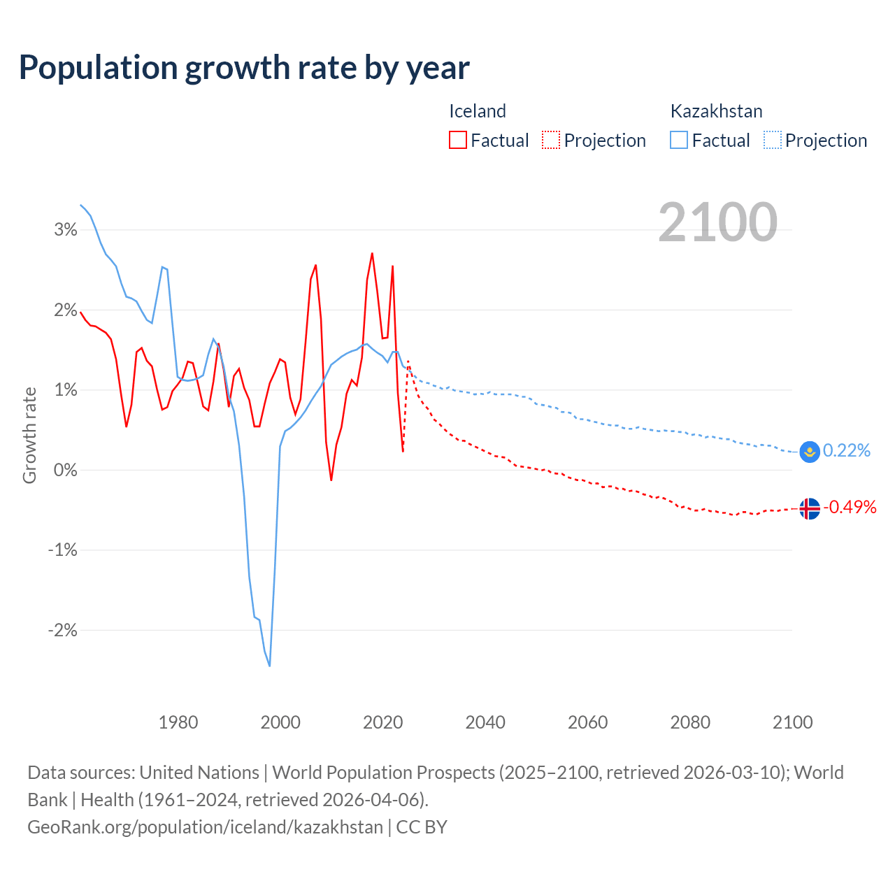 - For the last 10 years, Iceland has had an average growth rate of +1.63% per year vs +1.46% in Kazakhstan.