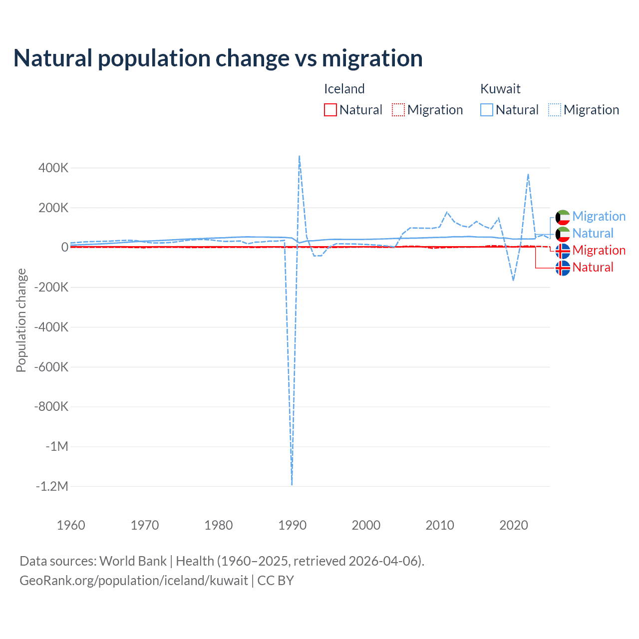 Over the last 10 years, 30.7% of the population change in Iceland is from natural causes (a gain of 20,128 people) and 69.3% is from migration (a gain of 45,356 people). In Kuwait 35.8% is from natural causes (a gain of 470,645 people) and 64.2% is from migration (a gain of 845,142 people).