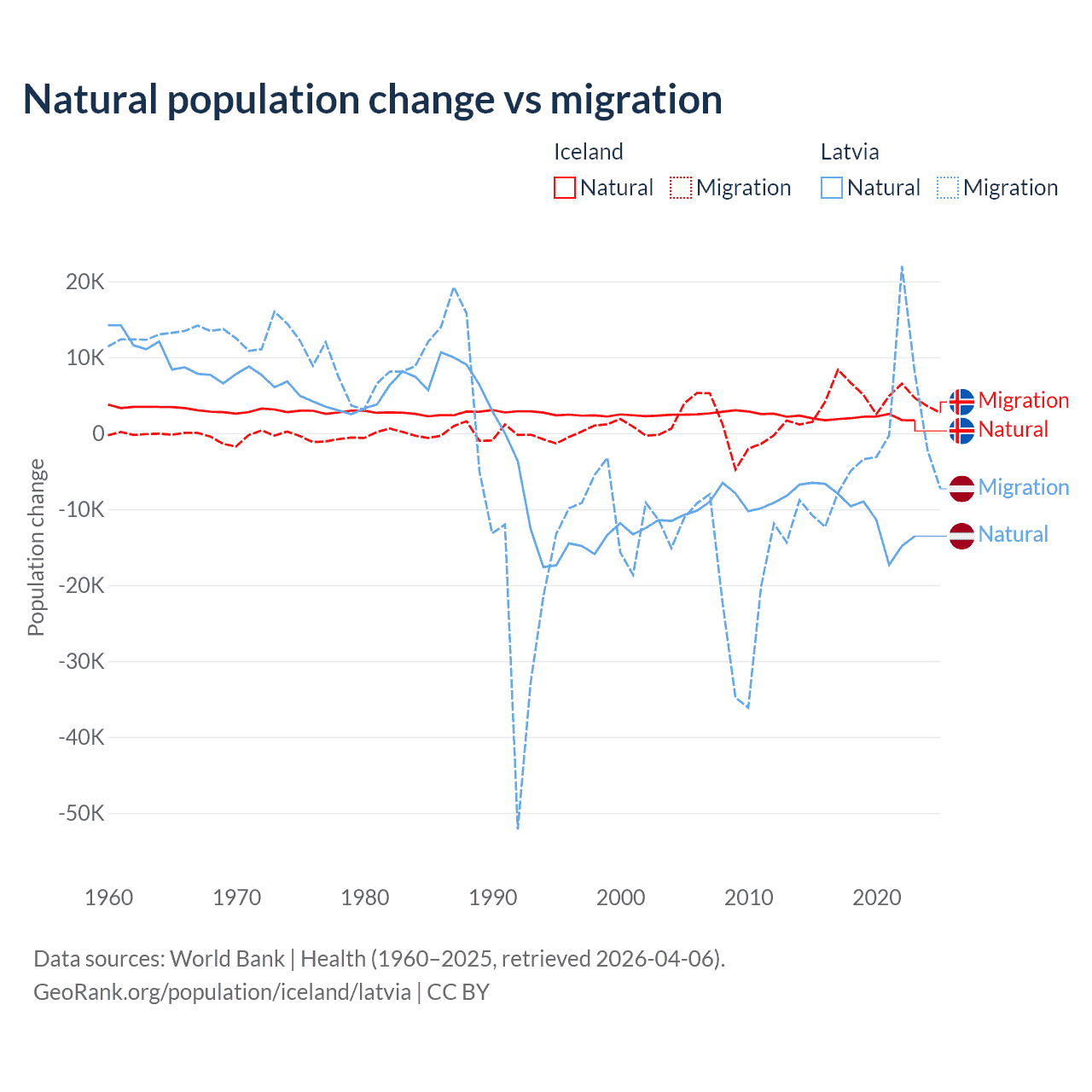 Over the last 10 years, 30.7% of the population change in Iceland is from natural causes (a gain of 20,128 people) and 69.3% is from migration (a gain of 45,356 people). In Latvia 82.7% is from natural causes (a loss of 103,711 people) and 17.3% is from migration (a loss of 21,641 people).