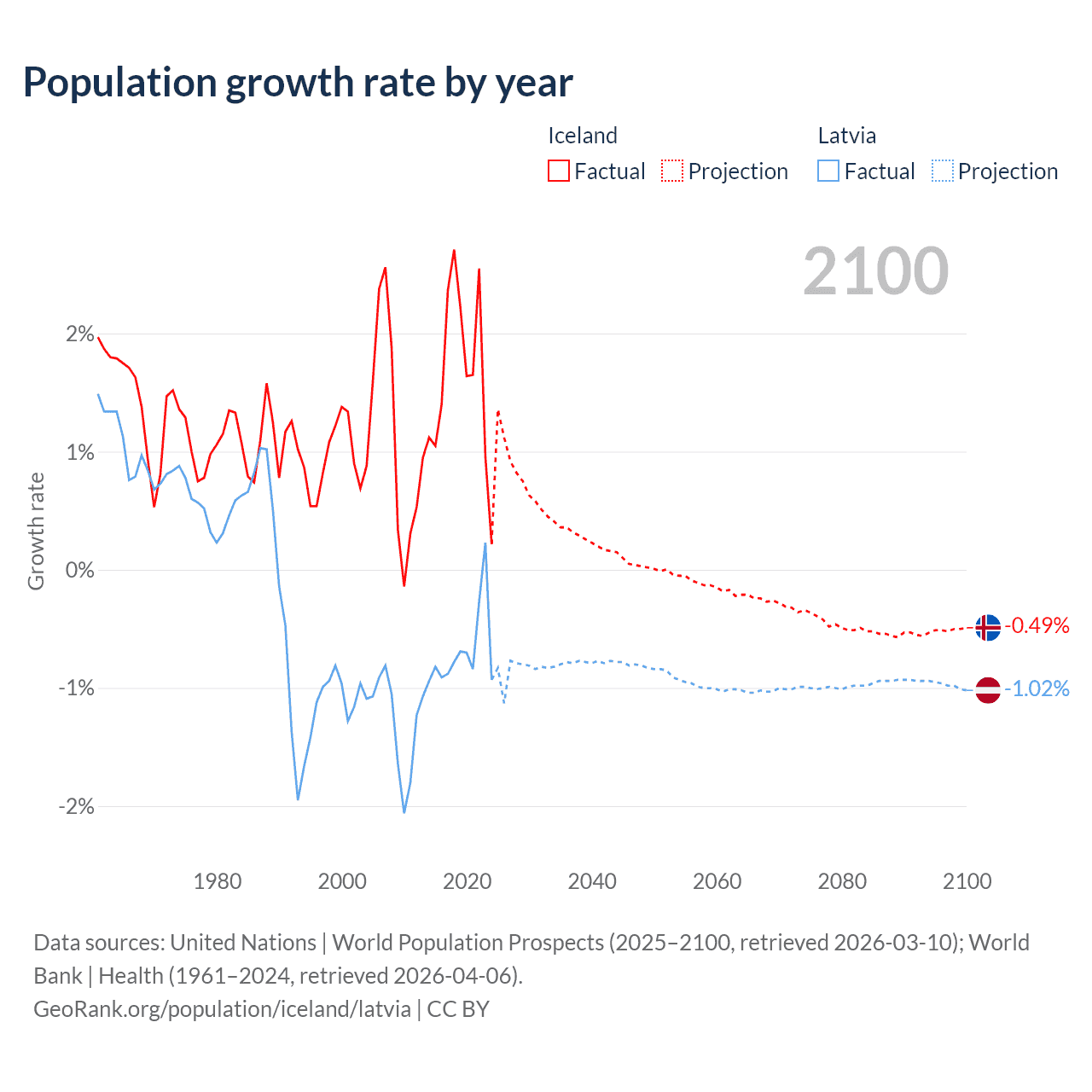 - For the last 10 years, Iceland has had an average growth rate of +1.63% per year vs -0.68% in Latvia.
