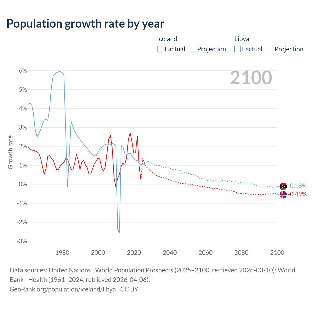 - For the last 10 years, Iceland has had an average growth rate of +1.63% per year vs +1.44% in Libya.