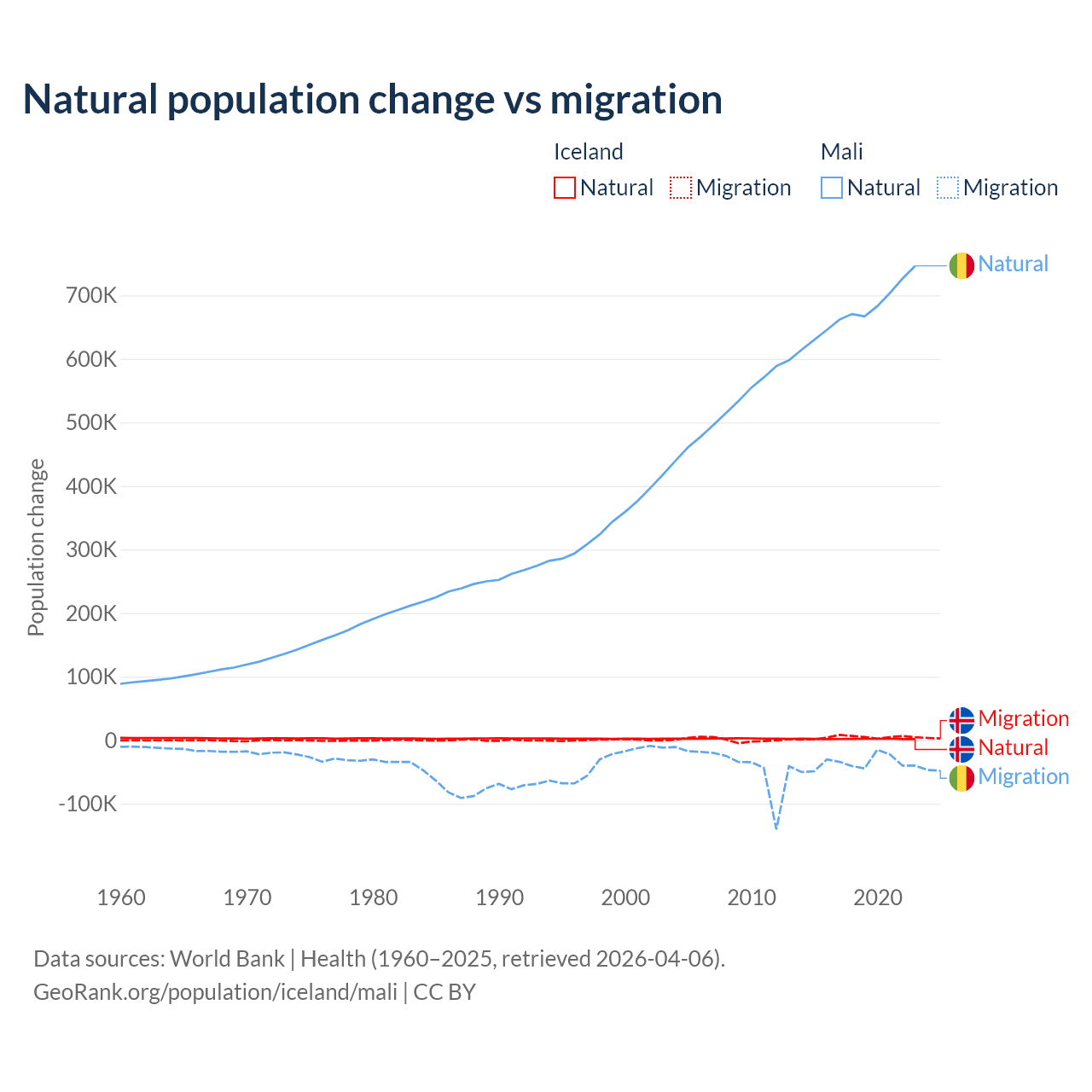 Over the last 10 years, 30.7% of the population change in Iceland is from natural causes (a gain of 20,128 people) and 69.3% is from migration (a gain of 45,356 people). In Mali 94.9% is from natural causes (a gain of 6,749,473 people) and 5.13% is from migration (a loss of 365,292 people).