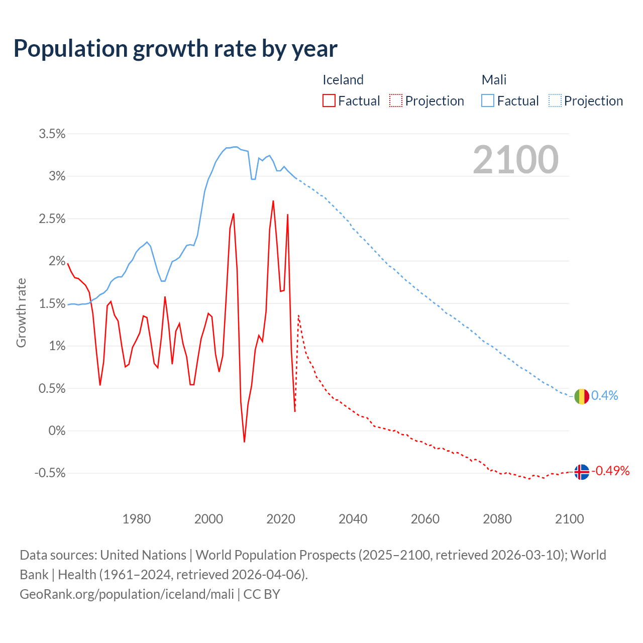 - For the last 10 years, Iceland has had an average growth rate of +1.63% per year vs +3.12% in Mali.