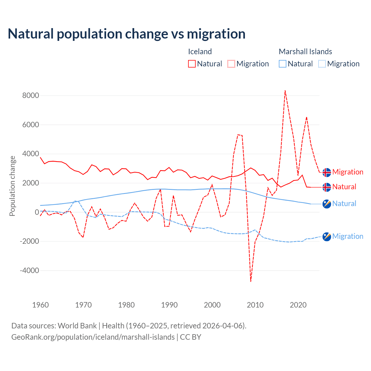 Over the last 10 years, 30.7% of the population change in Iceland is from natural causes (a gain of 20,128 people) and 69.3% is from migration (a gain of 45,356 people). In the Marshall Islands 27.8% is from natural causes (a gain of 7,592 people) and 72.2% is from migration (a loss of 19,682 people).
