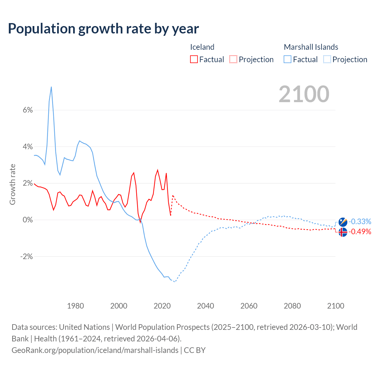 - For the last 10 years, Iceland has had an average growth rate of +1.63% per year vs -2.69% in the Marshall Islands.