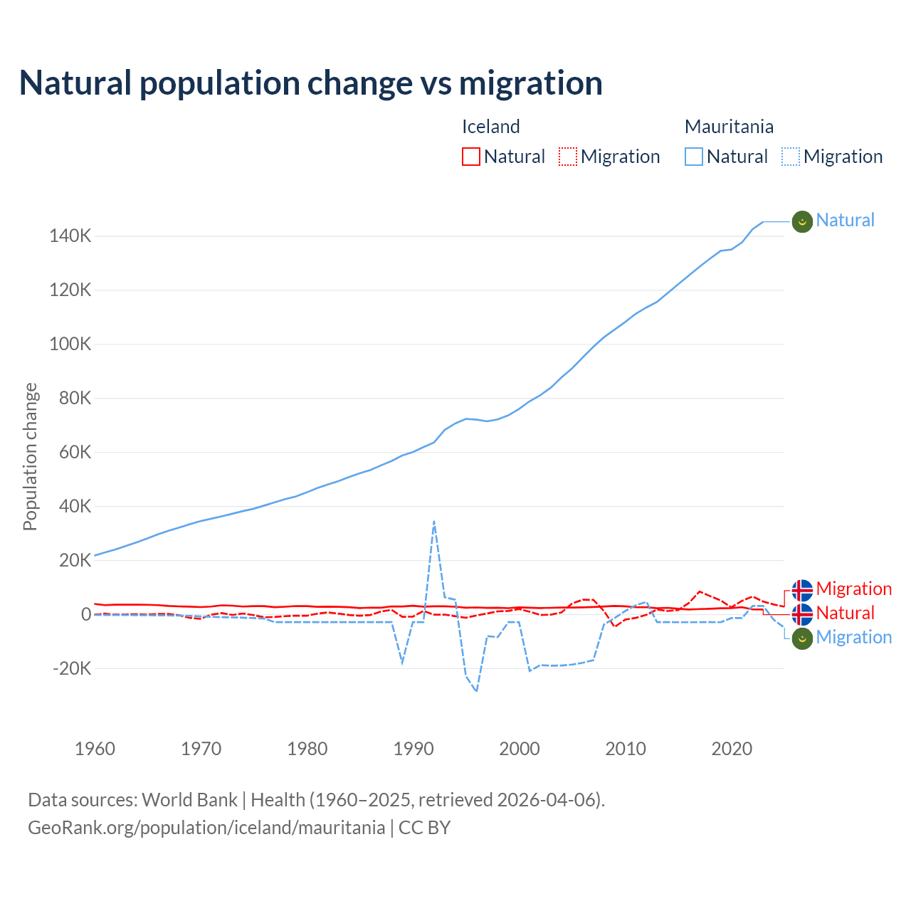 Over the last 10 years, 30.7% of the population change in Iceland is from natural causes (a gain of 20,128 people) and 69.3% is from migration (a gain of 45,356 people). In Mauritania 98.9% is from natural causes (a gain of 1,320,903 people) and 1.12% is from migration (a loss of 14,982 people).