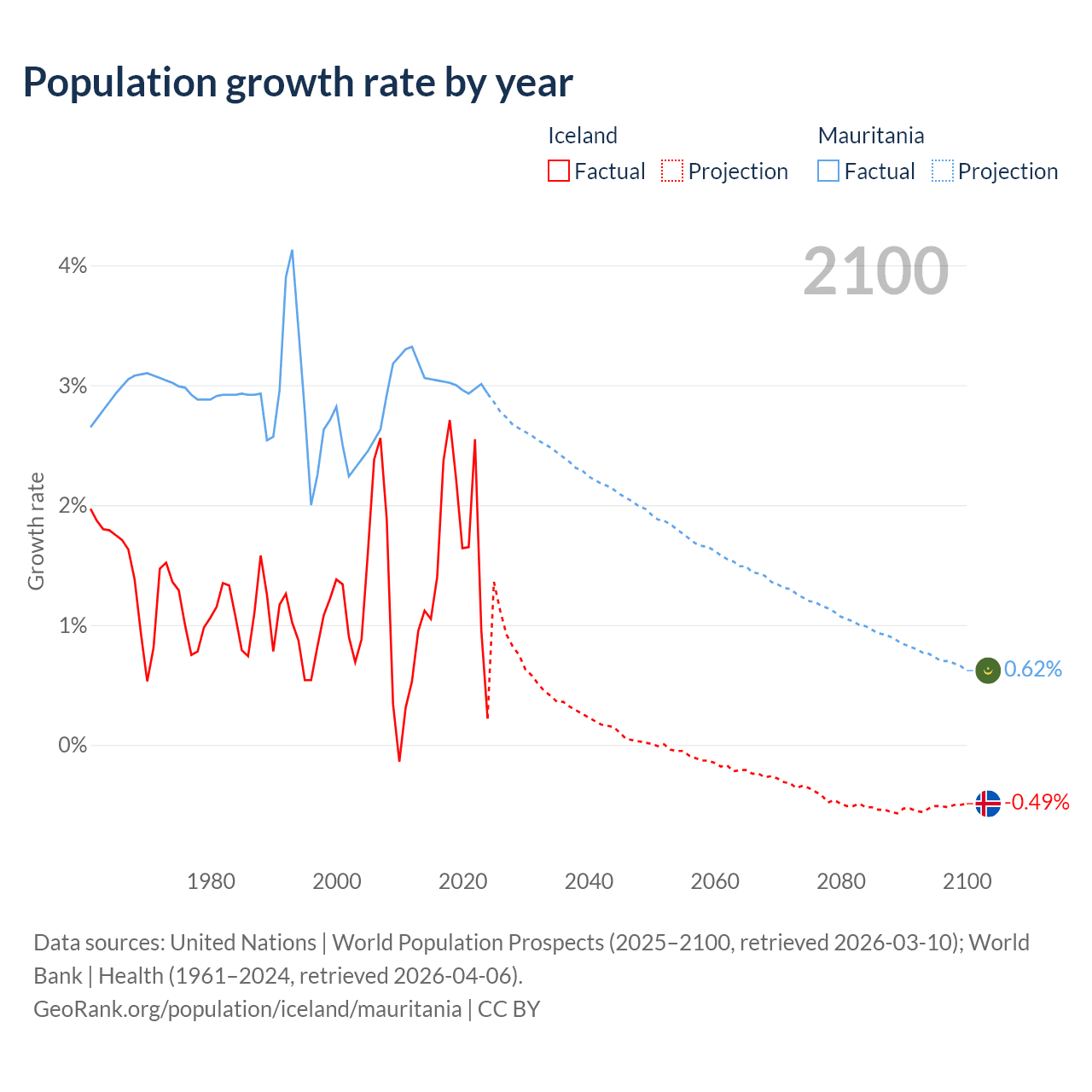 - For the last 10 years, Iceland has had an average growth rate of +1.63% per year vs +3% in Mauritania.