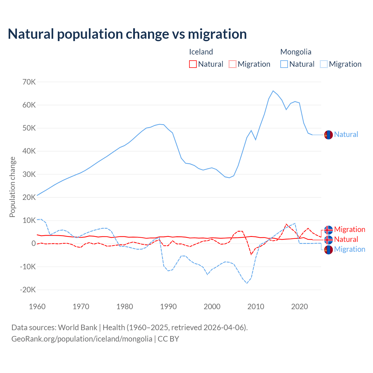 Over the last 10 years, 30.7% of the population change in Iceland is from natural causes (a gain of 20,128 people) and 69.3% is from migration (a gain of 45,356 people). In Mongolia 94.1% is from natural causes (a gain of 580,367 people) and 5.87% is from migration (a gain of 36,163 people).