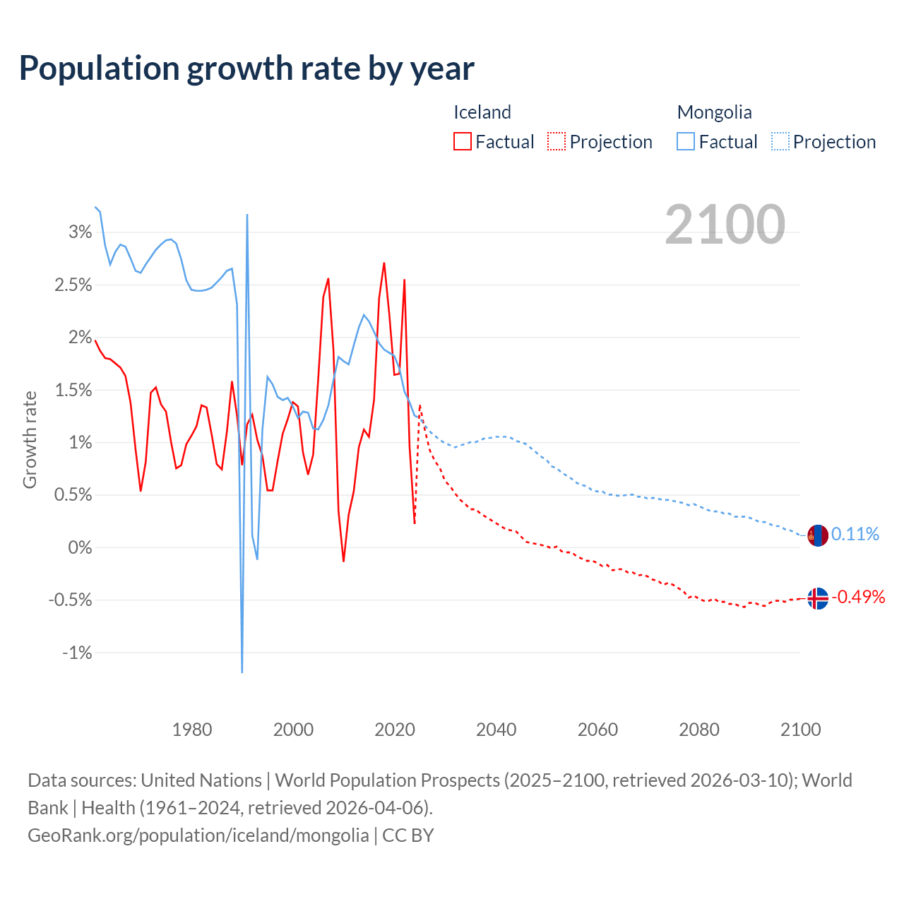 - For the last 10 years, Iceland has had an average growth rate of +1.63% per year vs +1.79% in Mongolia.