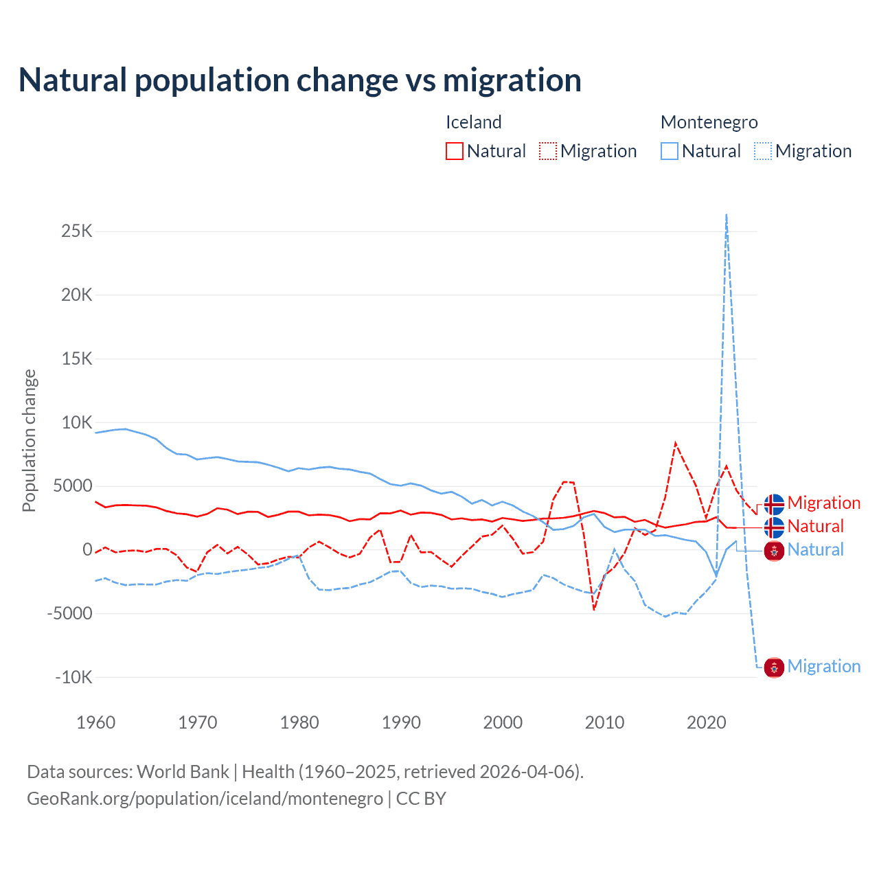 Over the last 10 years, 30.7% of the population change in Iceland is from natural causes (a gain of 20,128 people) and 69.3% is from migration (a gain of 45,356 people). In Montenegro 52.4% is from natural causes (a gain of 4,501 people) and 47.6% is from migration (a gain of 4,095 people).