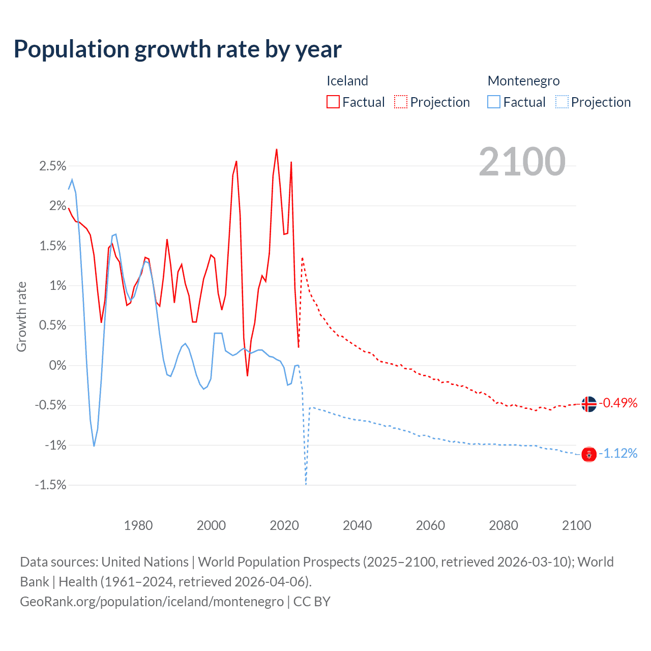 - For the last 10 years, Iceland has had an average growth rate of +1.63% per year vs +0.01% in Montenegro.