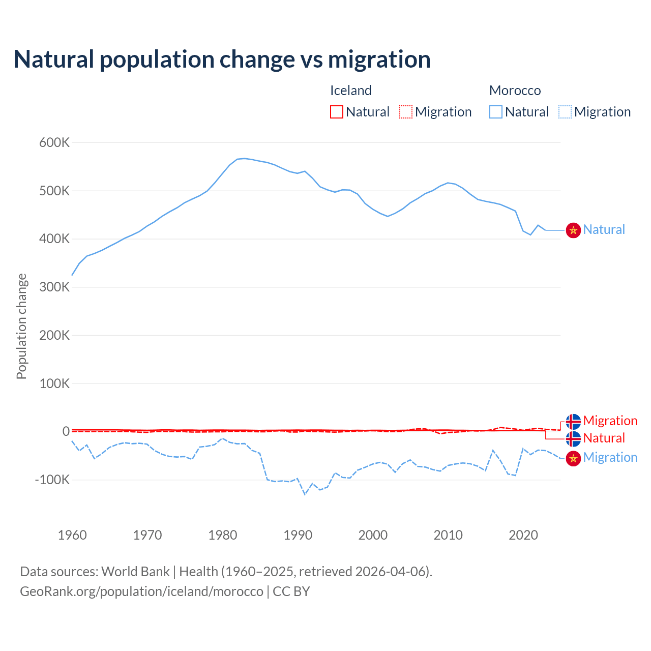 Over the last 10 years, 30.7% of the population change in Iceland is from natural causes (a gain of 20,128 people) and 69.3% is from migration (a gain of 45,356 people). In Morocco 88.3% is from natural causes (a gain of 4,495,223 people) and 11.7% is from migration (a loss of 594,083 people).