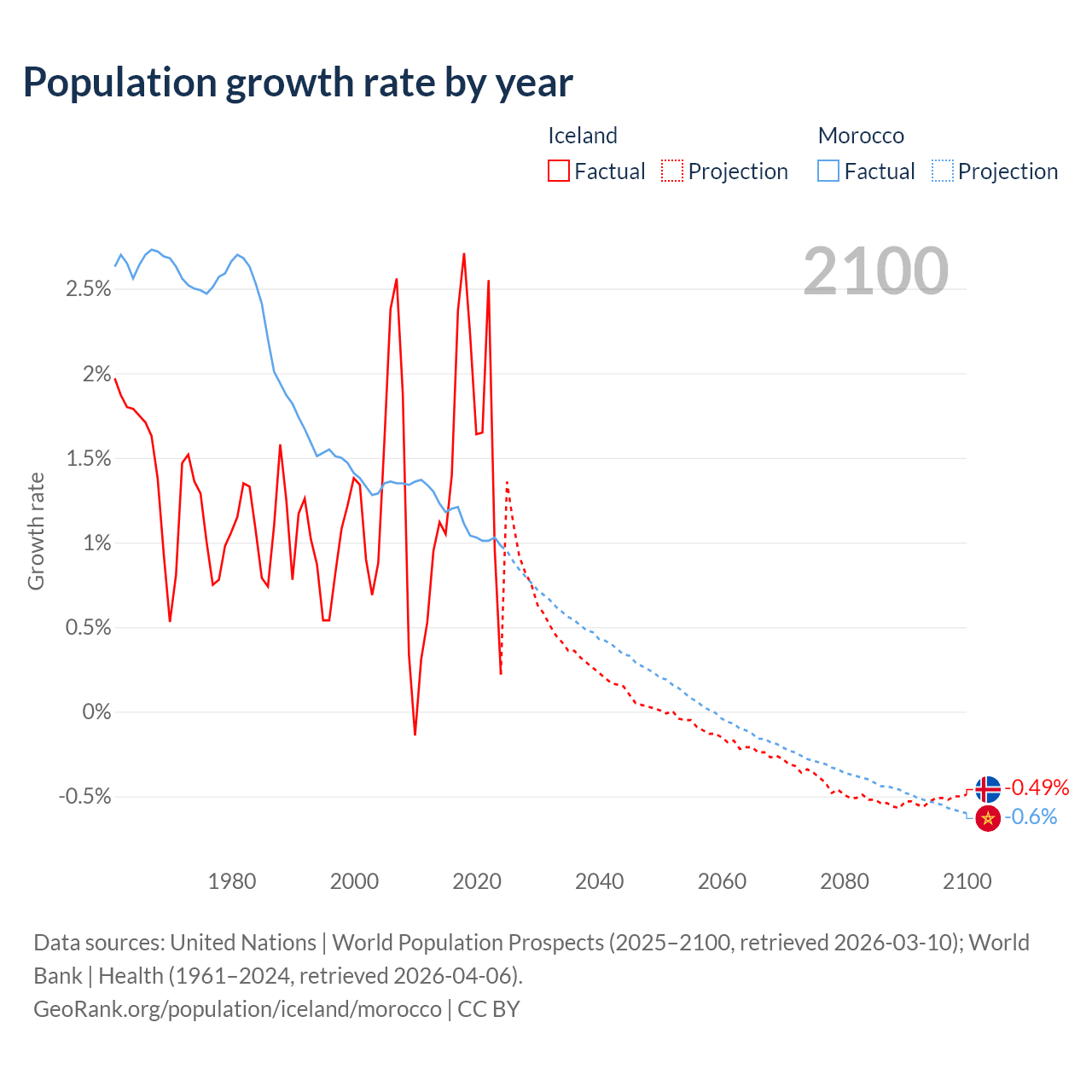 - For the last 10 years, Iceland has had an average growth rate of +1.63% per year vs +1.09% in Morocco.