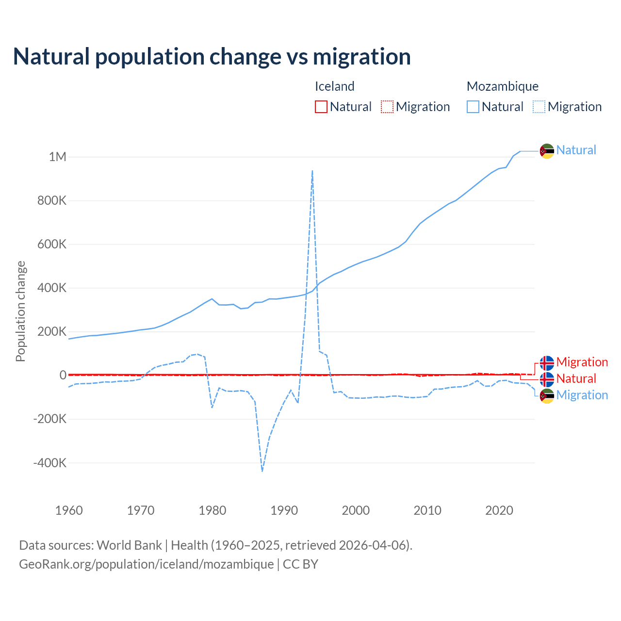 Over the last 10 years, 30.7% of the population change in Iceland is from natural causes (a gain of 20,128 people) and 69.3% is from migration (a gain of 45,356 people). In Mozambique 95.9% is from natural causes (a gain of 9,108,203 people) and 4.15% is from migration (a loss of 393,923 people).