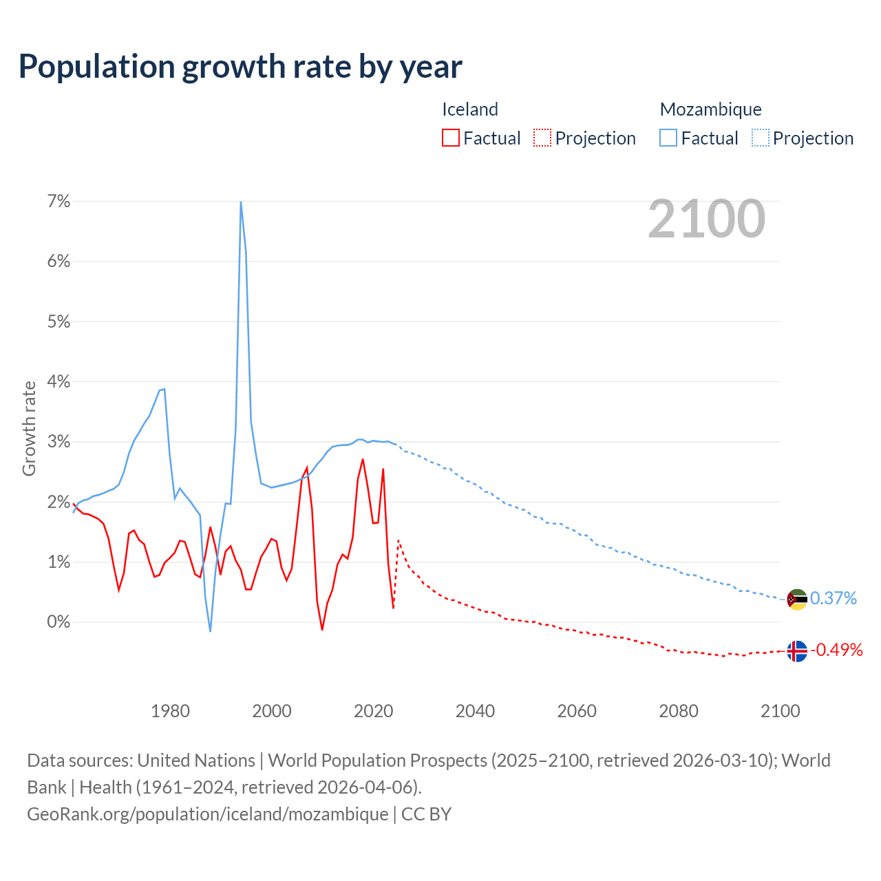- For the last 10 years, Iceland has had an average growth rate of +1.63% per year vs +2.99% in Mozambique.