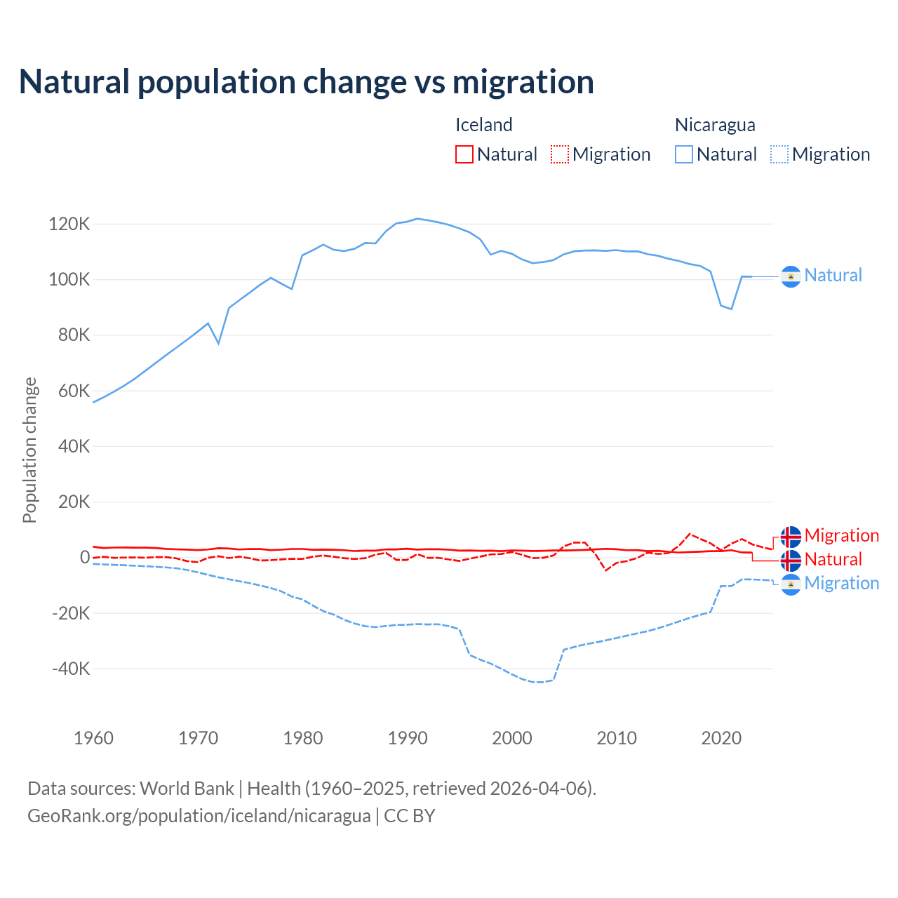 Over the last 10 years, 30.7% of the population change in Iceland is from natural causes (a gain of 20,128 people) and 69.3% is from migration (a gain of 45,356 people). In Nicaragua 85.5% is from natural causes (a gain of 1,017,084 people) and 14.5% is from migration (a loss of 172,078 people).