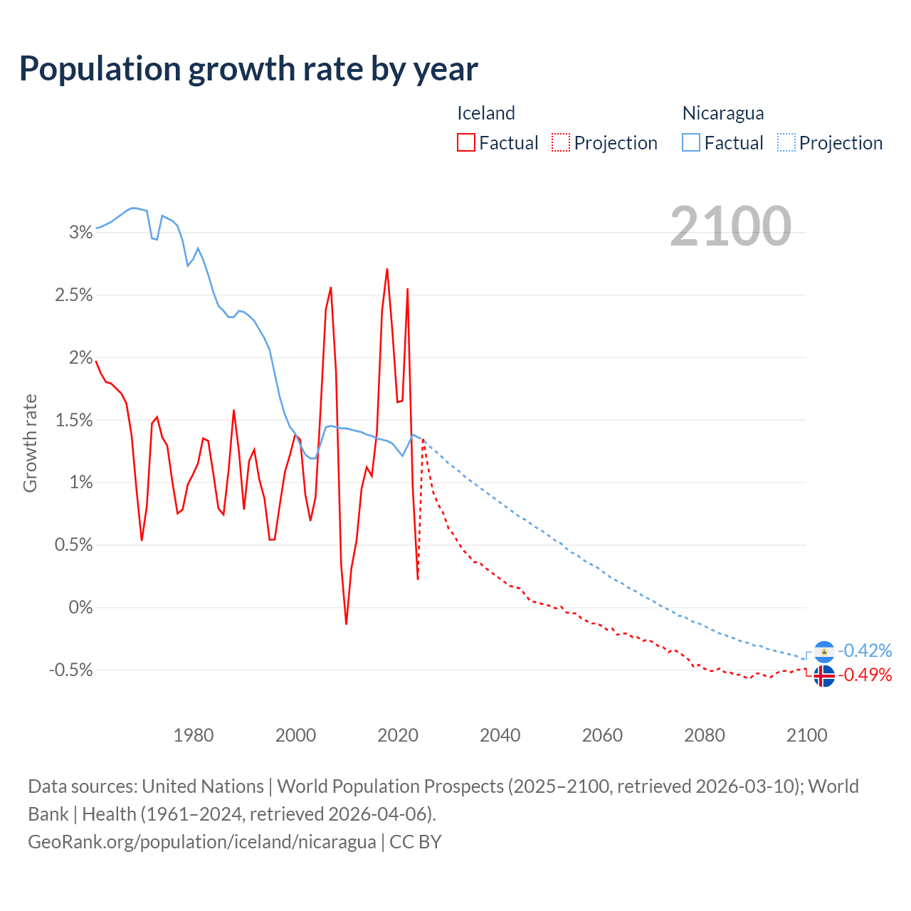 - For the last 10 years, Iceland has had an average growth rate of +1.63% per year vs +1.33% in Nicaragua.