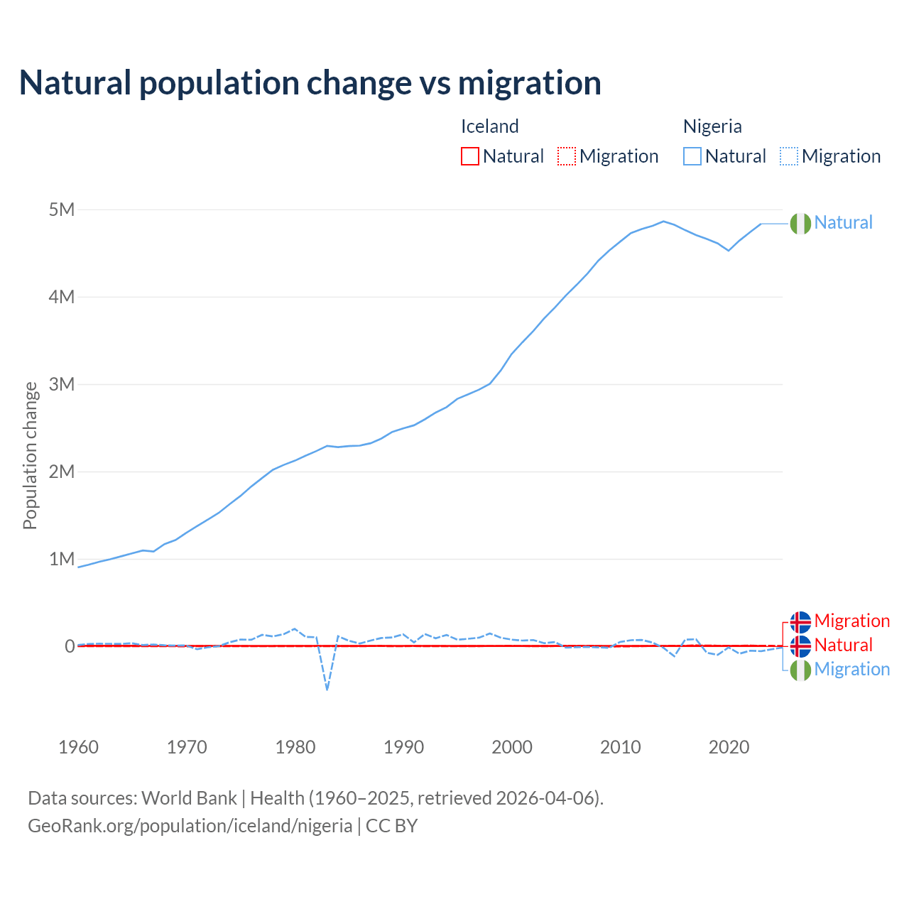 Over the last 10 years, 30.7% of the population change in Iceland is from natural causes (a gain of 20,128 people) and 69.3% is from migration (a gain of 45,356 people). In Nigeria 99.2% is from natural causes (a gain of 47,163,517 people) and 0.77% is from migration (a loss of 368,103 people).