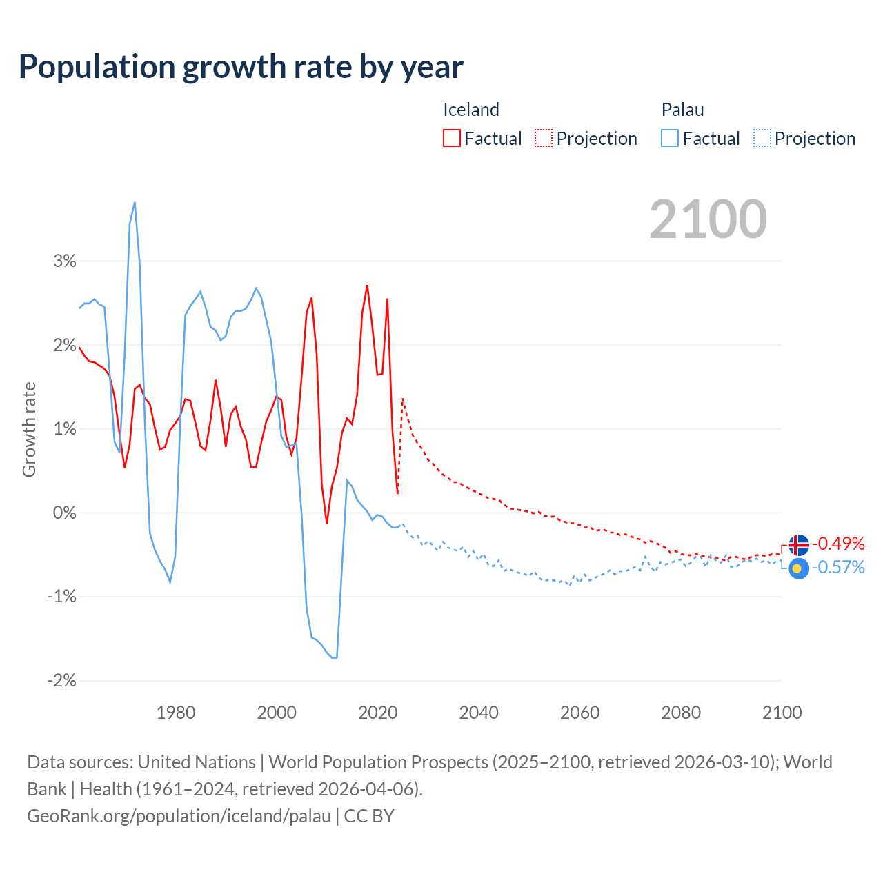 - For the last 10 years, Iceland has had an average growth rate of +1.63% per year vs +0.02% in Palau.