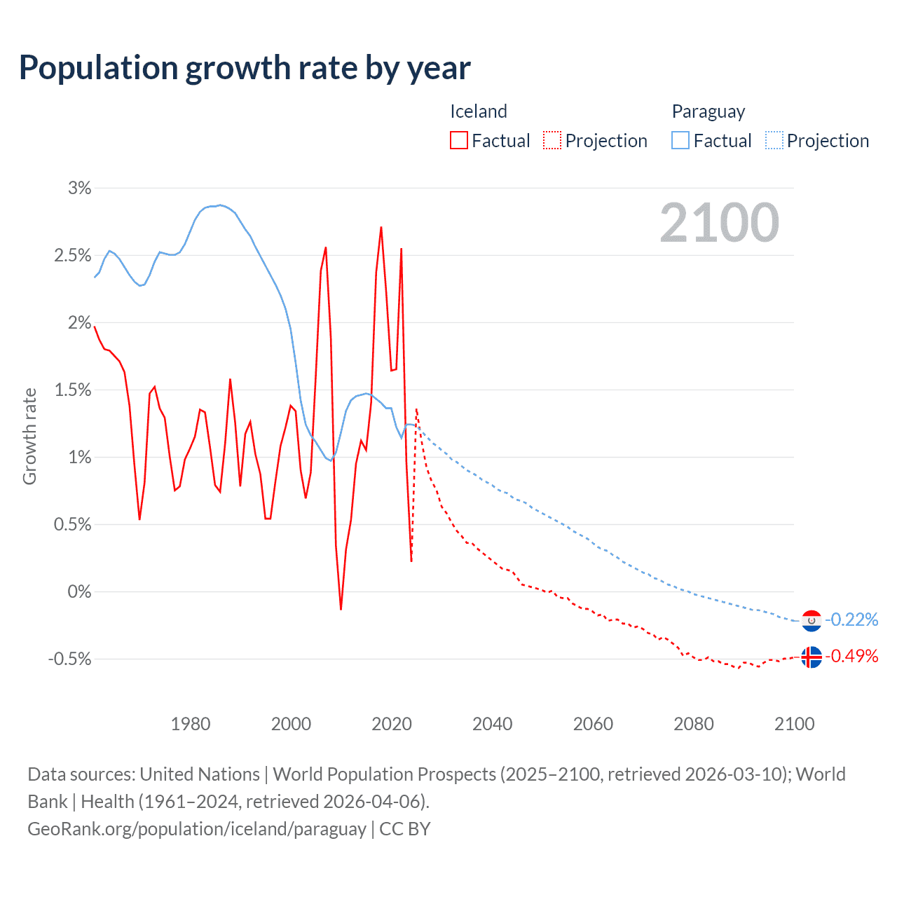 - For the last 10 years, Iceland has had an average growth rate of +1.63% per year vs +1.34% in Paraguay.