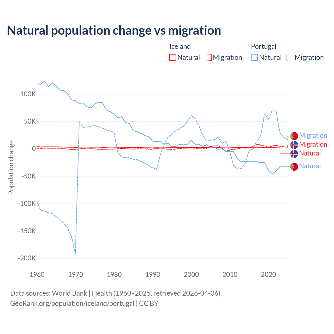 Over the last 10 years, 30.7% of the population change in Iceland is from natural causes (a gain of 20,128 people) and 69.3% is from migration (a gain of 45,356 people). In Portugal 51% is from natural causes (a loss of 302,748 people) and 49% is from migration (a gain of 290,554 people).