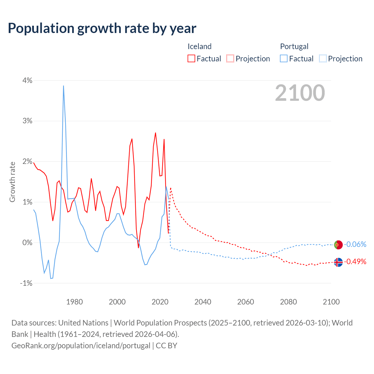 - For the last 10 years, Iceland has had an average growth rate of +1.63% per year vs +0.21% in Portugal.