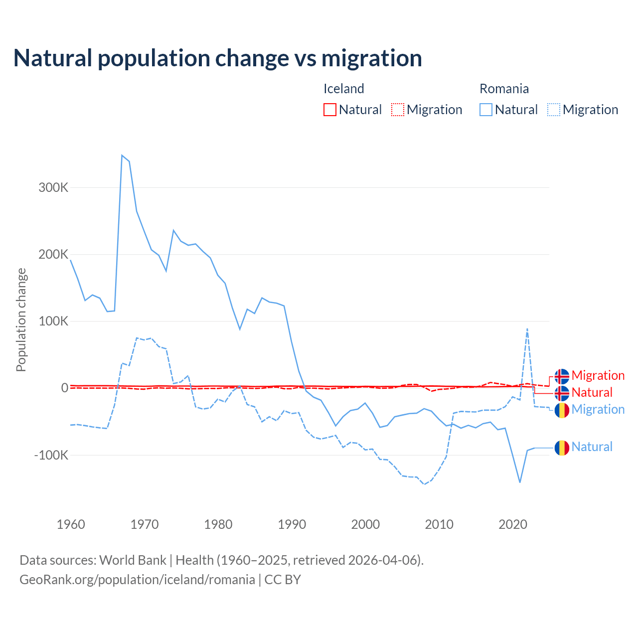 Over the last 10 years, 30.7% of the population change in Iceland is from natural causes (a gain of 20,128 people) and 69.3% is from migration (a gain of 45,356 people). In Romania 82% is from natural causes (a loss of 766,295 people) and 18% is from migration (a loss of 167,917 people).