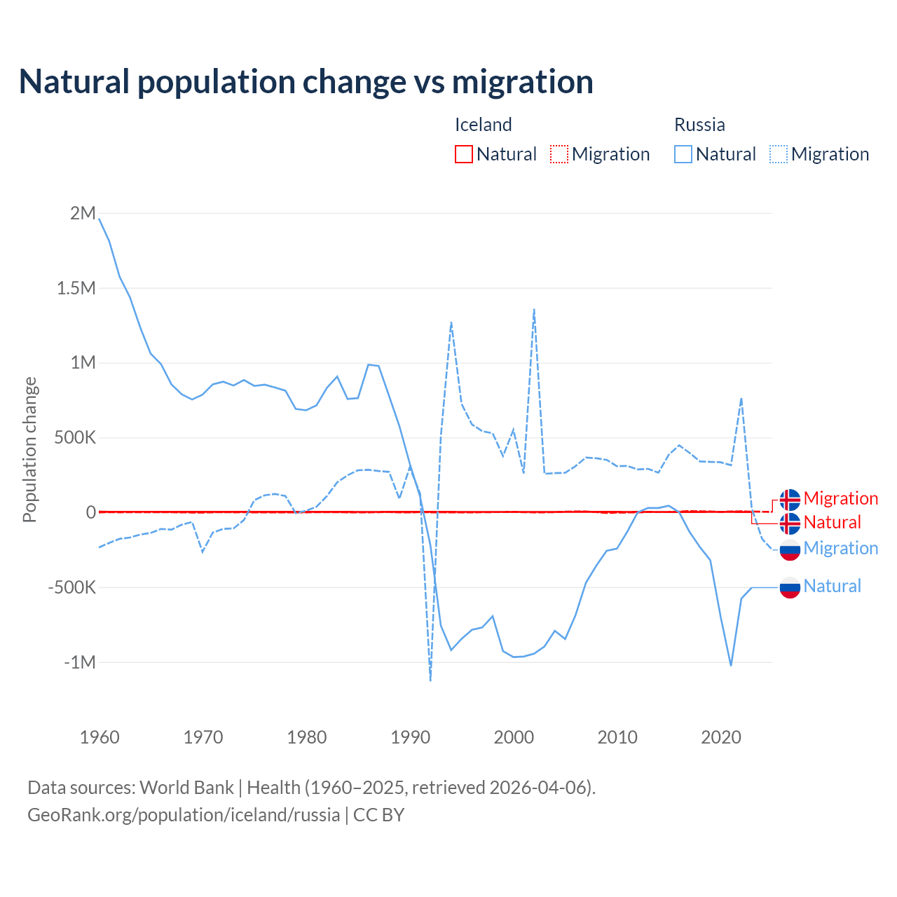 Over the last 10 years, 30.7% of the population change in Iceland is from natural causes (a gain of 20,128 people) and 69.3% is from migration (a gain of 45,356 people). In Russia 48.6% is from natural causes (a loss of 3,416,377 people) and 51.4% is from migration (a gain of 3,611,826 people).