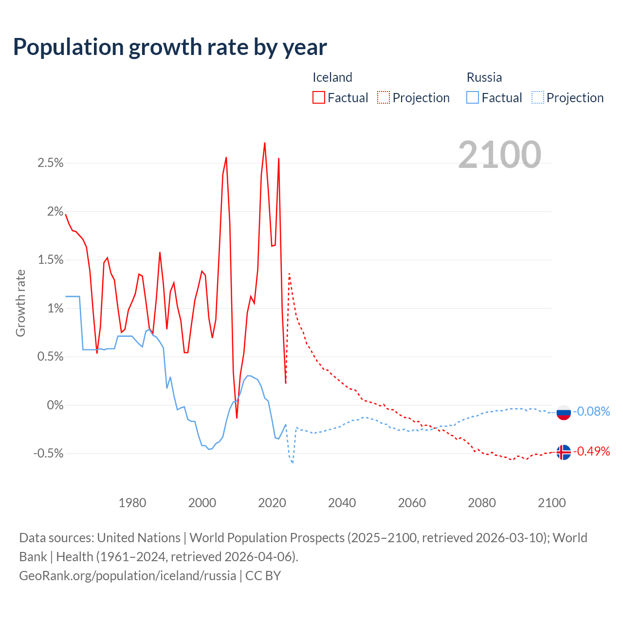 - For the last 10 years, Iceland has had an average growth rate of +1.63% per year vs -0.02% in Russia.
