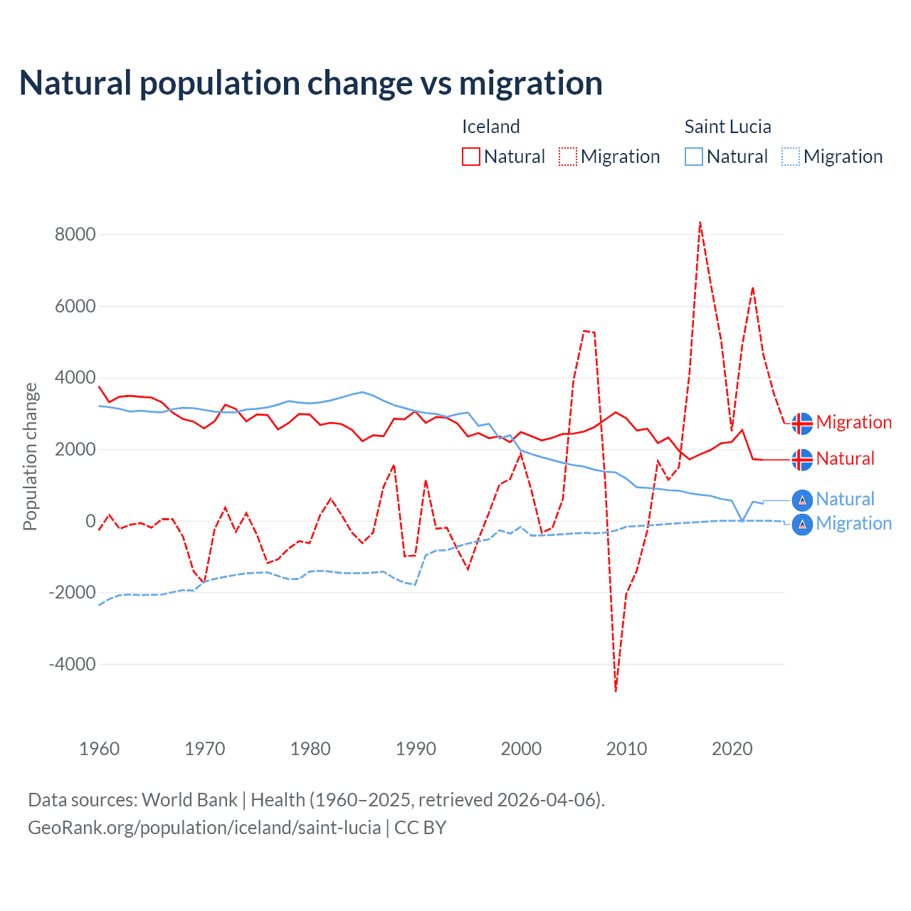 Over the last 10 years, 30.7% of the population change in Iceland is from natural causes (a gain of 20,128 people) and 69.3% is from migration (a gain of 45,356 people). In Saint Lucia 95.7% is from natural causes (a gain of 6,039 people) and 4.31% is from migration (a loss of 272 people).