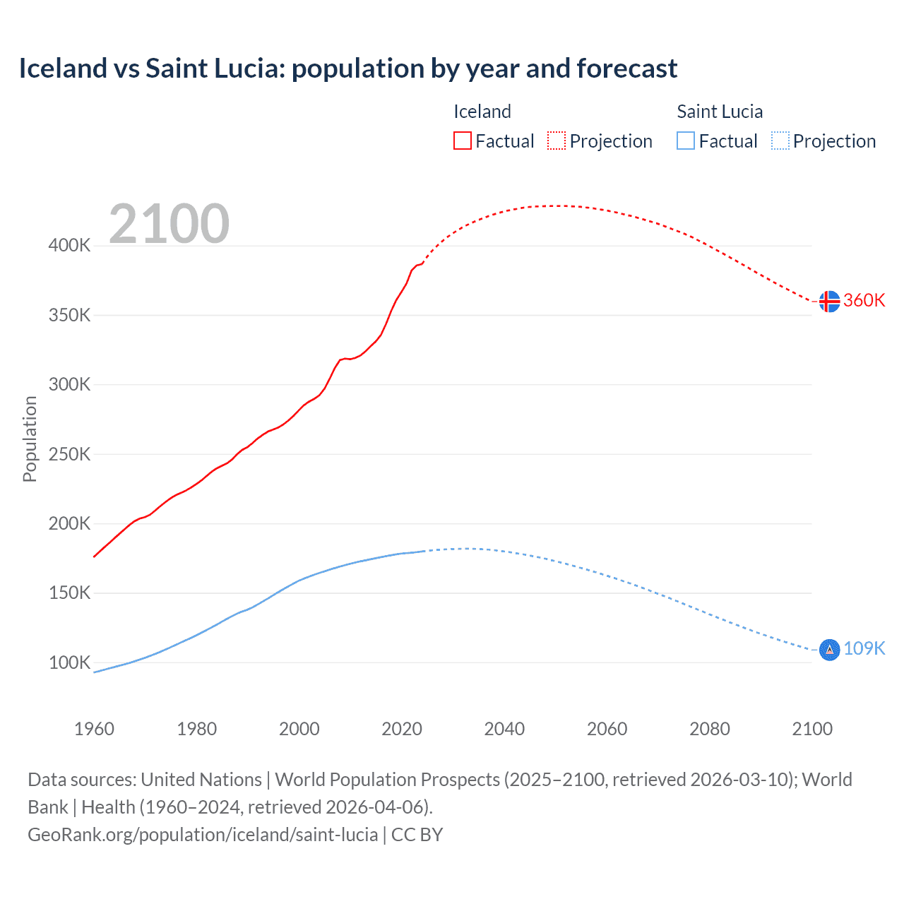 Iceland vs Saint Lucia: population by year and forecast