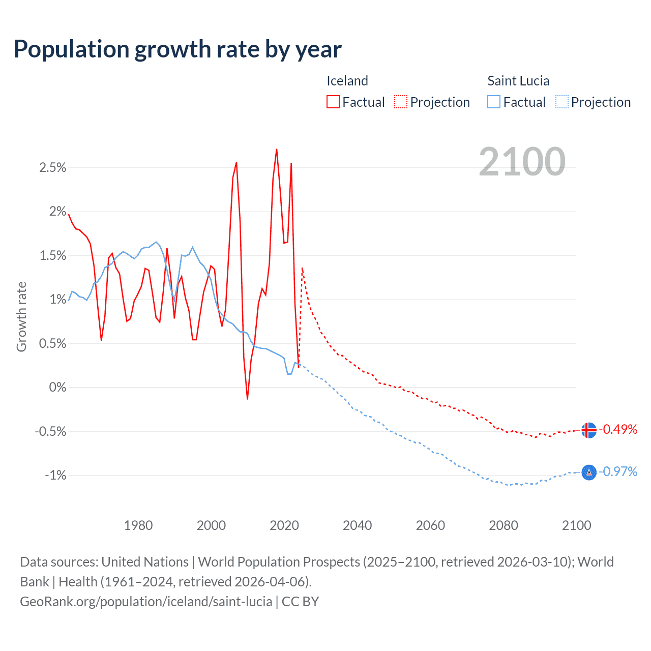 - For the last 10 years, Iceland has had an average growth rate of +1.63% per year vs +0.33% in Saint Lucia.