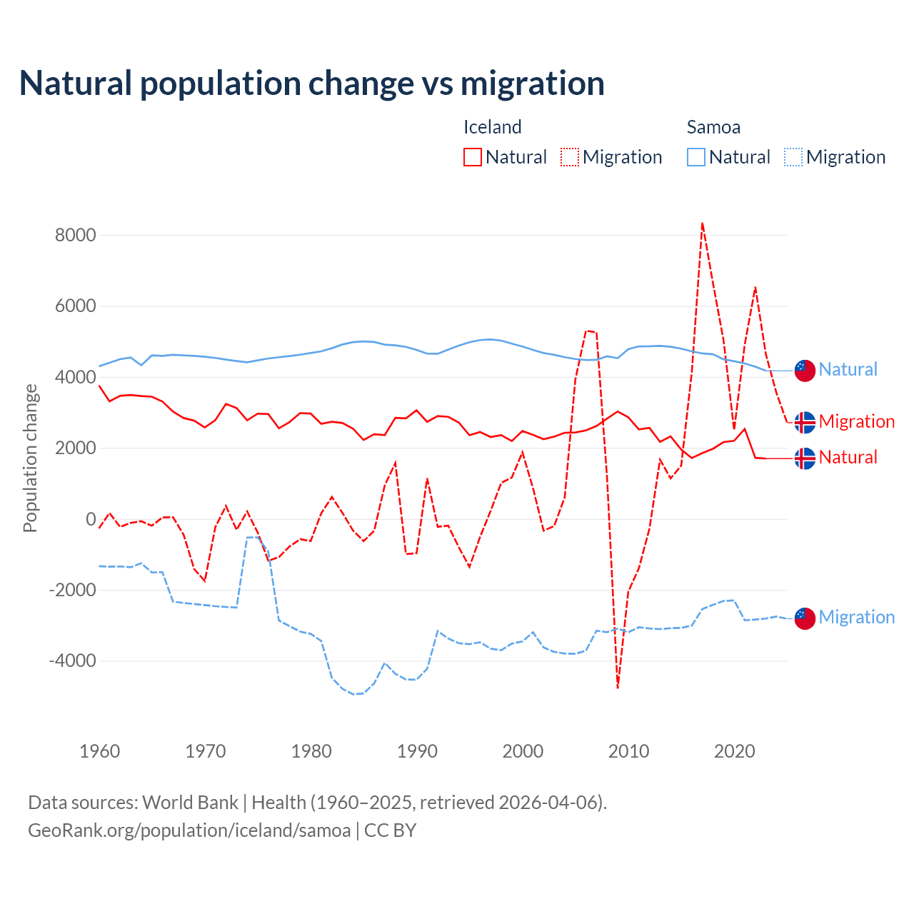Over the last 10 years, 30.7% of the population change in Iceland is from natural causes (a gain of 20,128 people) and 69.3% is from migration (a gain of 45,356 people). In Samoa 62.5% is from natural causes (a gain of 45,436 people) and 37.5% is from migration (a loss of 27,246 people).