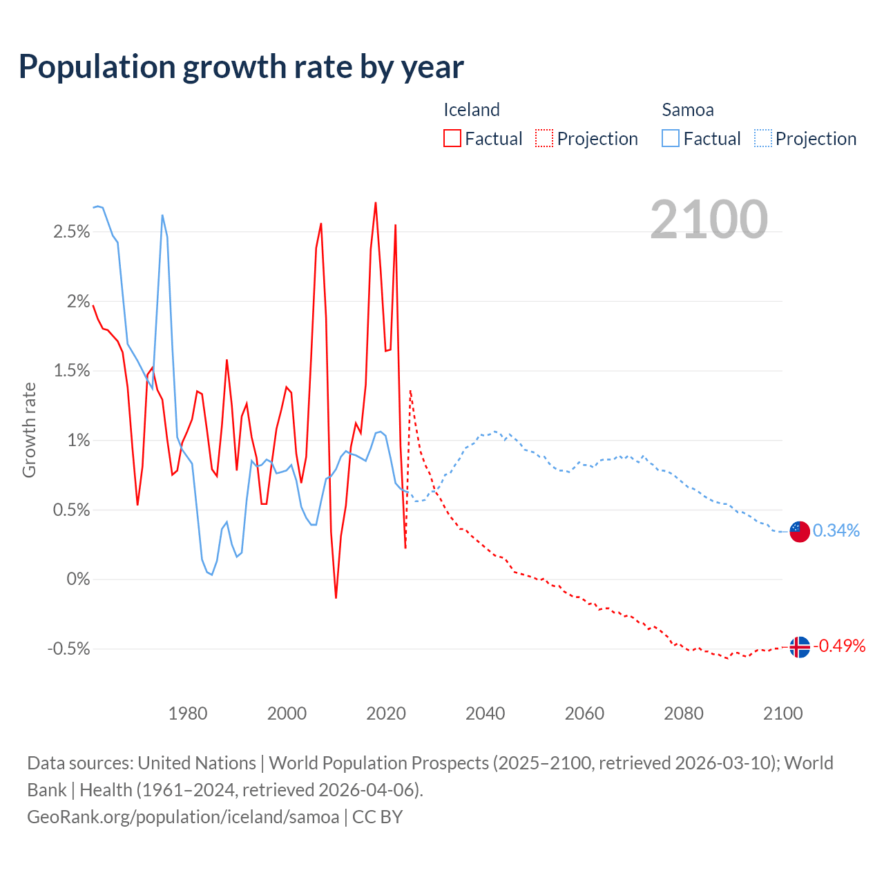 - For the last 10 years, Iceland has had an average growth rate of +1.63% per year vs +0.87% in Samoa.