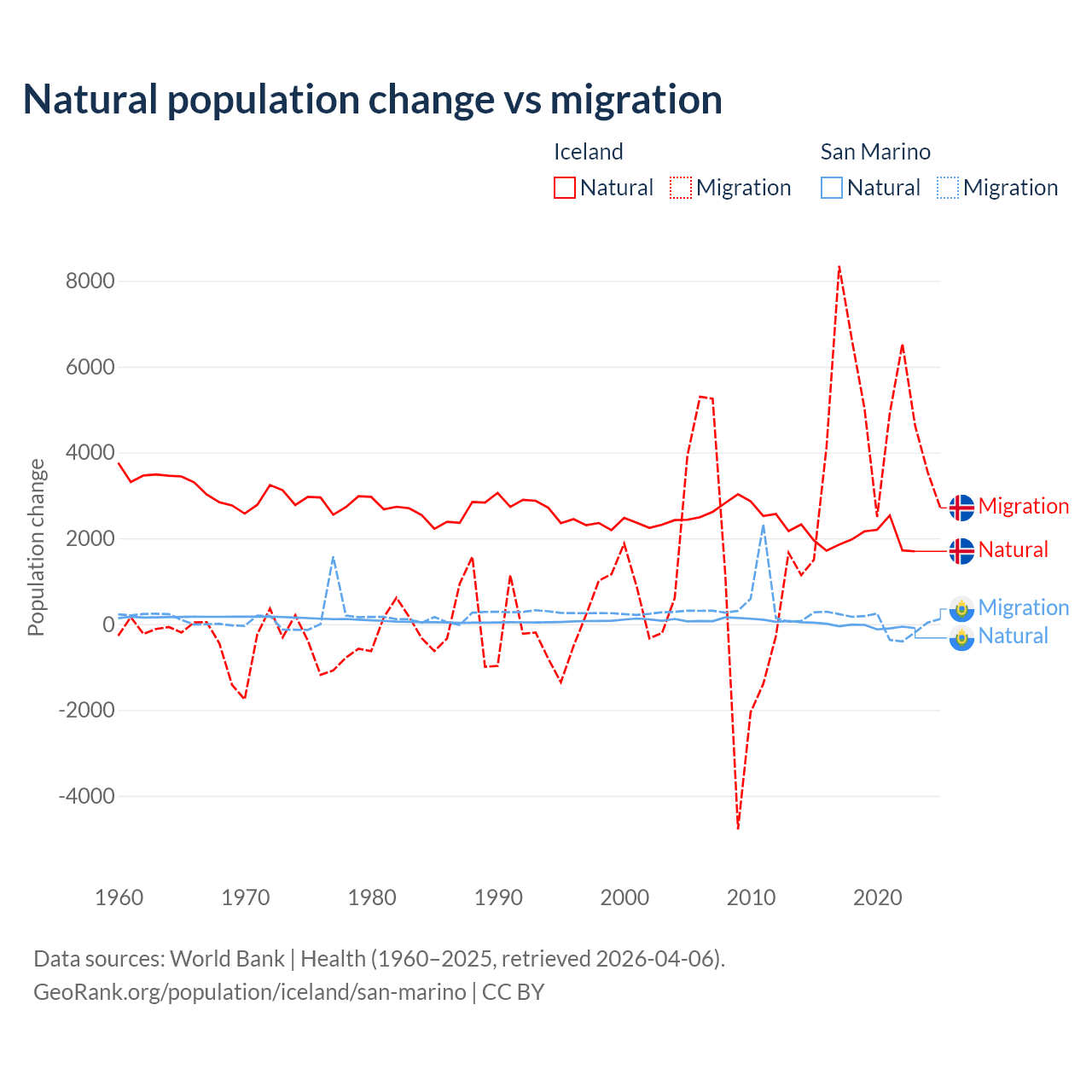 Over the last 10 years, 30.7% of the population change in Iceland is from natural causes (a gain of 20,128 people) and 69.3% is from migration (a gain of 45,356 people). In San Marino 40.9% is from natural causes (a loss of 358 people) and 59.1% is from migration (a gain of 517 people).