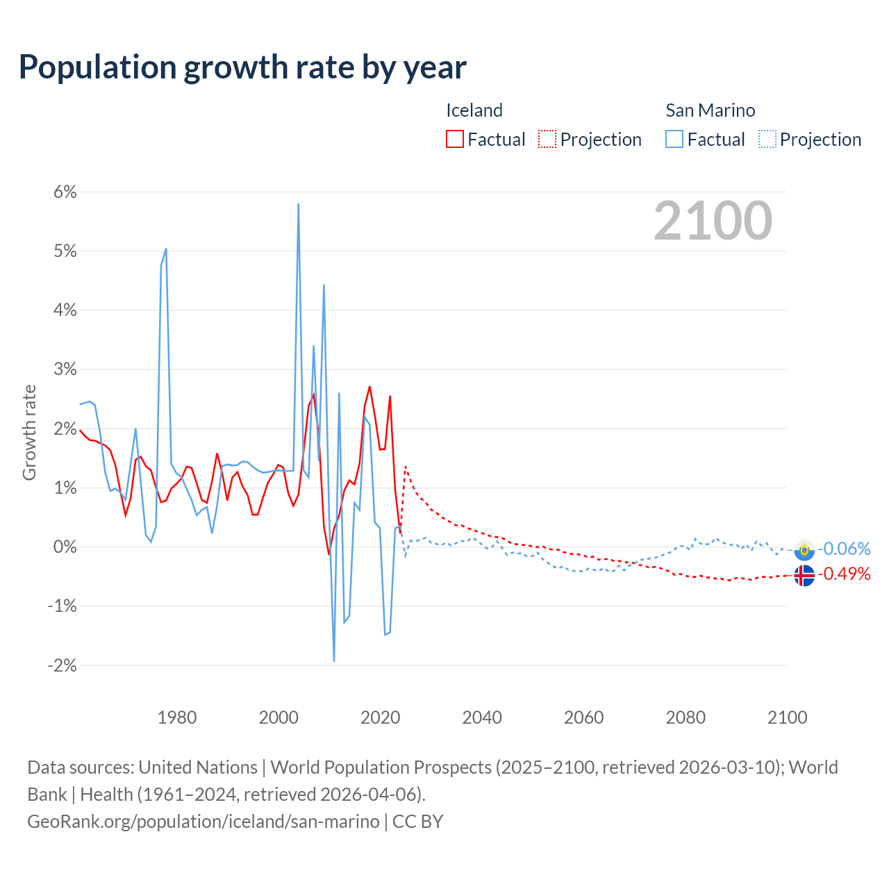 - For the last 10 years, Iceland has had an average growth rate of +1.63% per year vs +0.26% in San Marino.