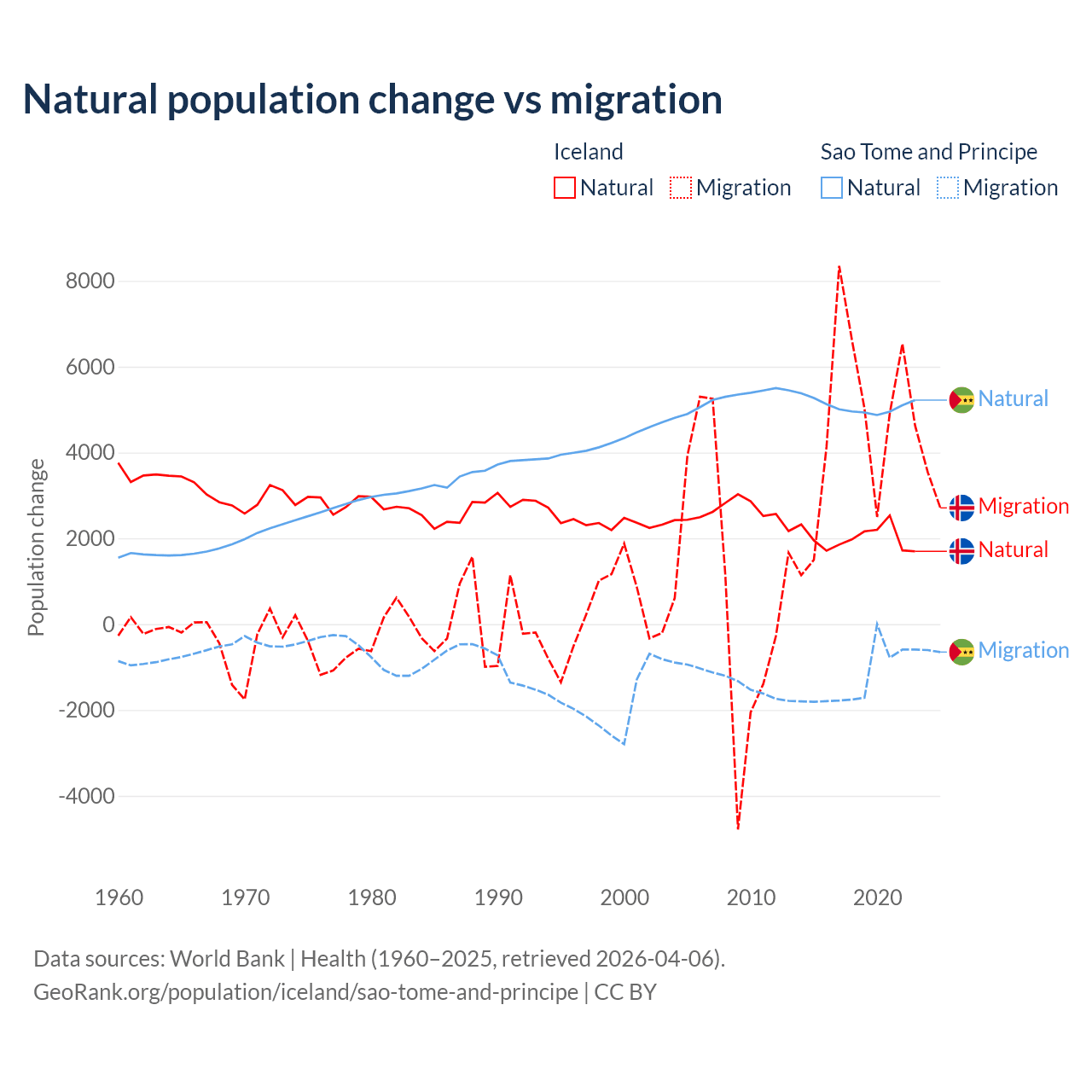 Over the last 10 years, 30.7% of the population change in Iceland is from natural causes (a gain of 20,128 people) and 69.3% is from migration (a gain of 45,356 people). In Sao Tome and Principe 80.1% is from natural causes (a gain of 50,822 people) and 19.9% is from migration (a loss of 12,621 people).