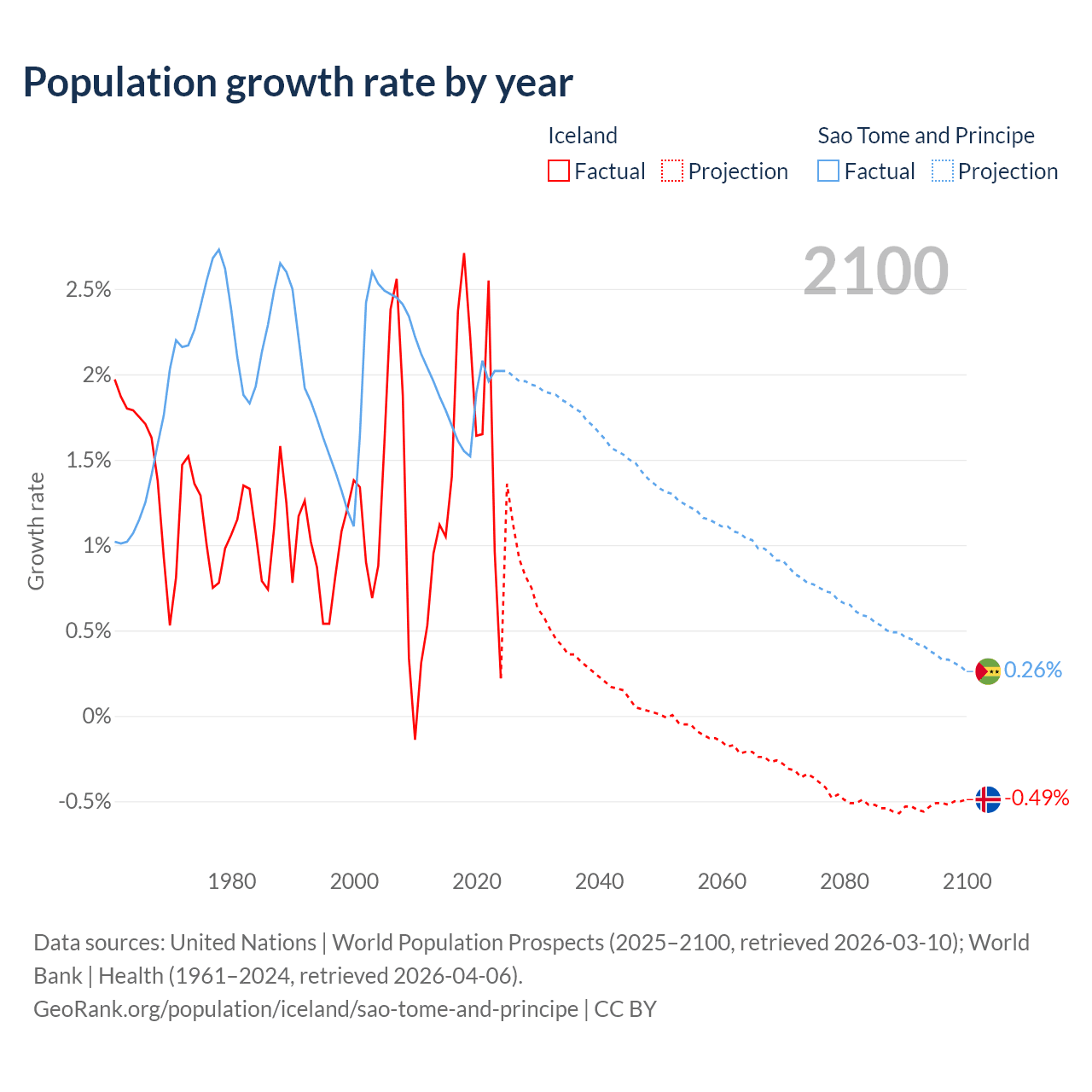 - For the last 10 years, Iceland has had an average growth rate of +1.63% per year vs +1.82% in Sao Tome and Principe.