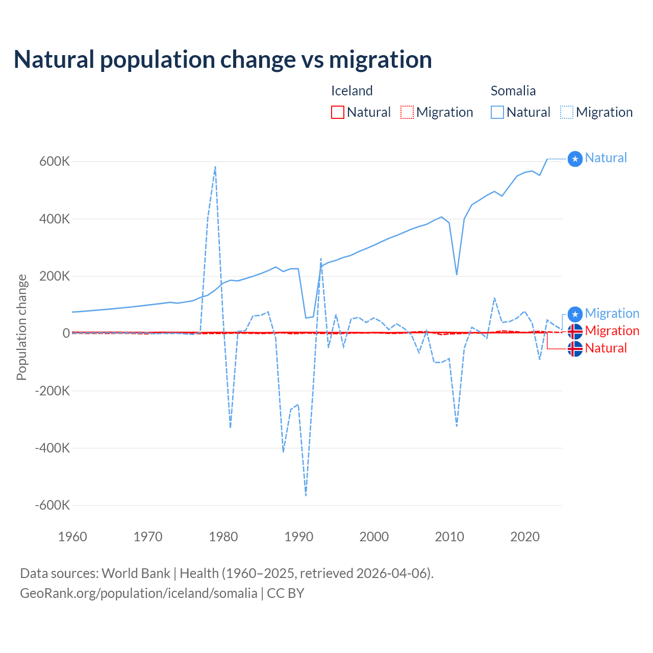 Over the last 10 years, 30.7% of the population change in Iceland is from natural causes (a gain of 20,128 people) and 69.3% is from migration (a gain of 45,356 people). In Somalia 94.4% is from natural causes (a gain of 5,270,105 people) and 5.58% is from migration (a gain of 311,487 people).