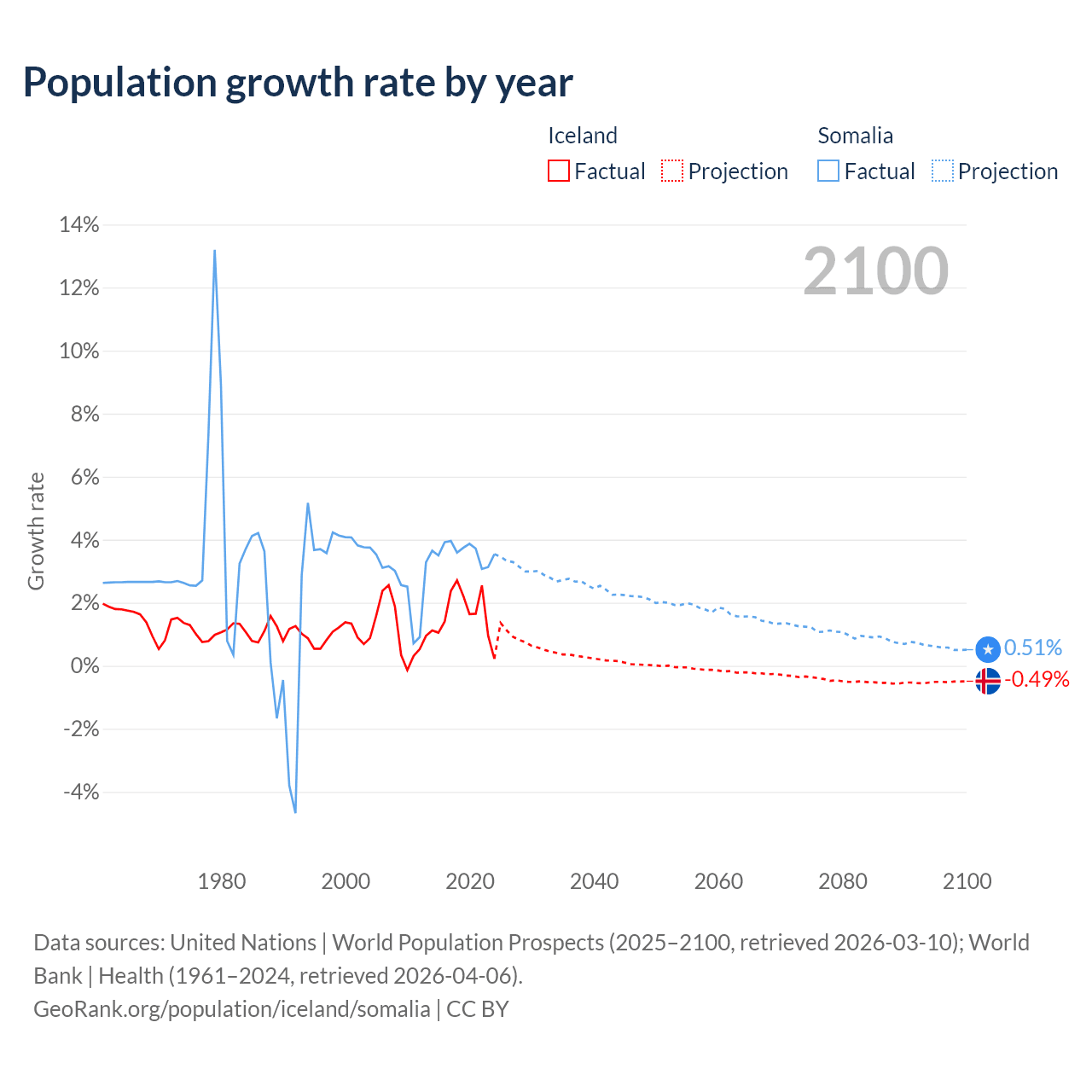 - For the last 10 years, Iceland has had an average growth rate of +1.63% per year vs +3.61% in Somalia.