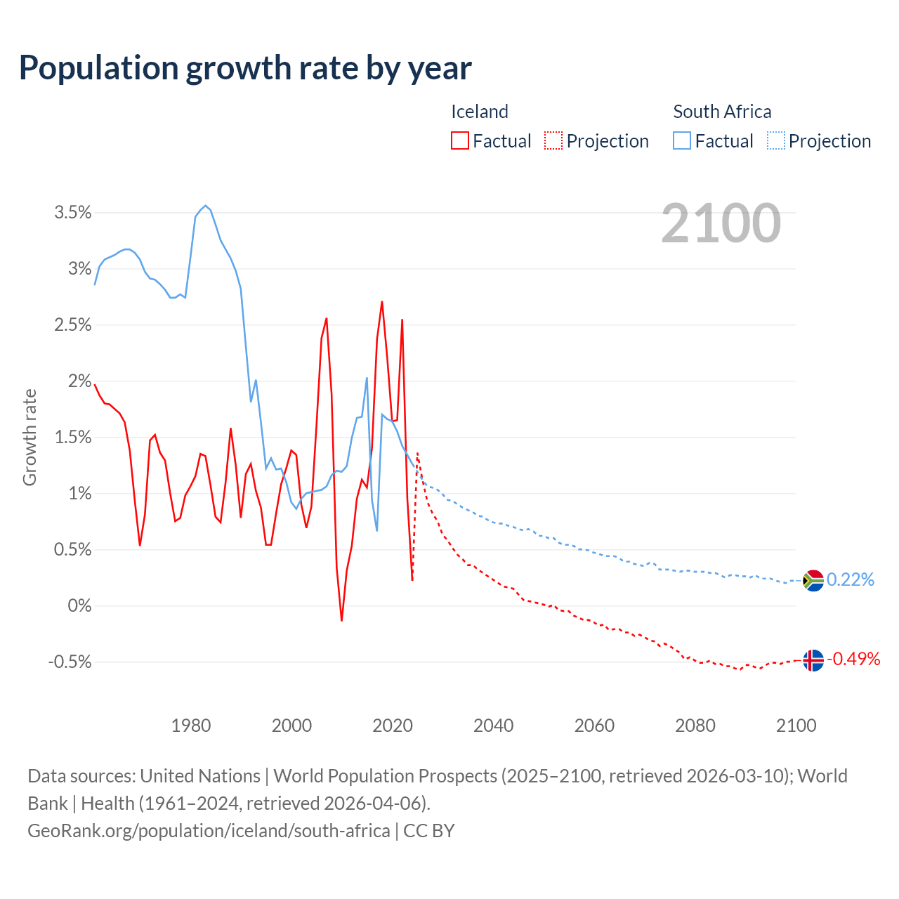 - For the last 10 years, Iceland has had an average growth rate of +1.63% per year vs +1.44% in South Africa.
