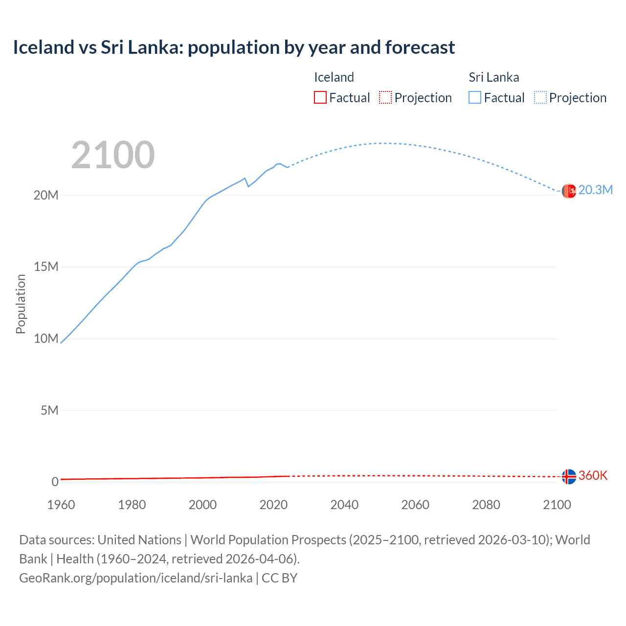 Iceland vs Sri Lanka: population by year and forecast
